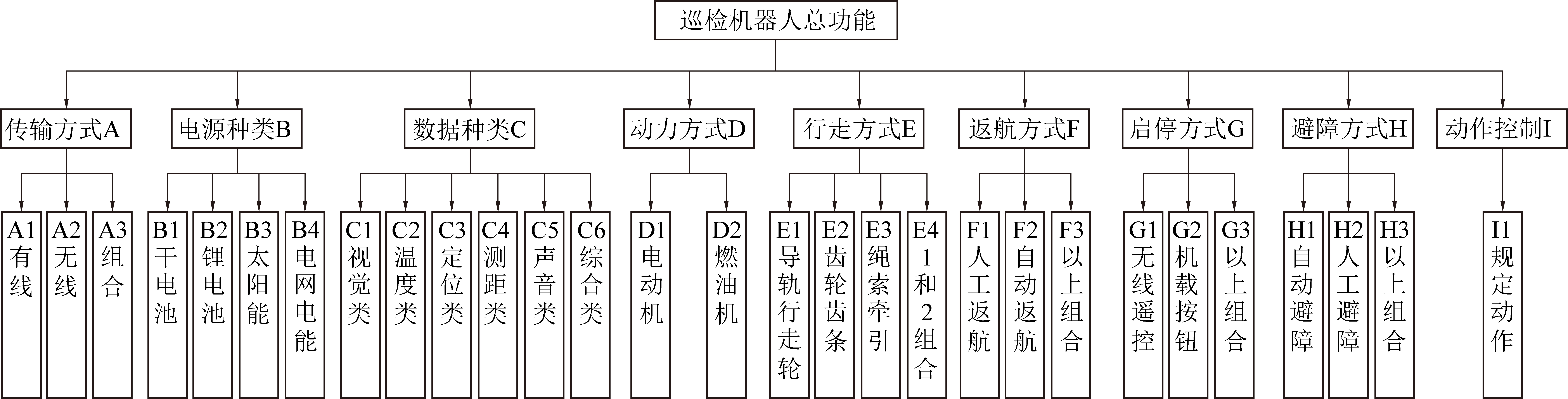 进一步地,按照功能分析法的基本原理,对图2中的子功能的解决方案进行分析,形成了如图3所示的煤矿带式输送机自动巡检机器人的子功能-解决方案组合图谱。通过构建图3中图谱的功能元形态学矩阵可以得出可能的系统方案的数量为:3×4×6×2×4×3×3×3×1=15 552。