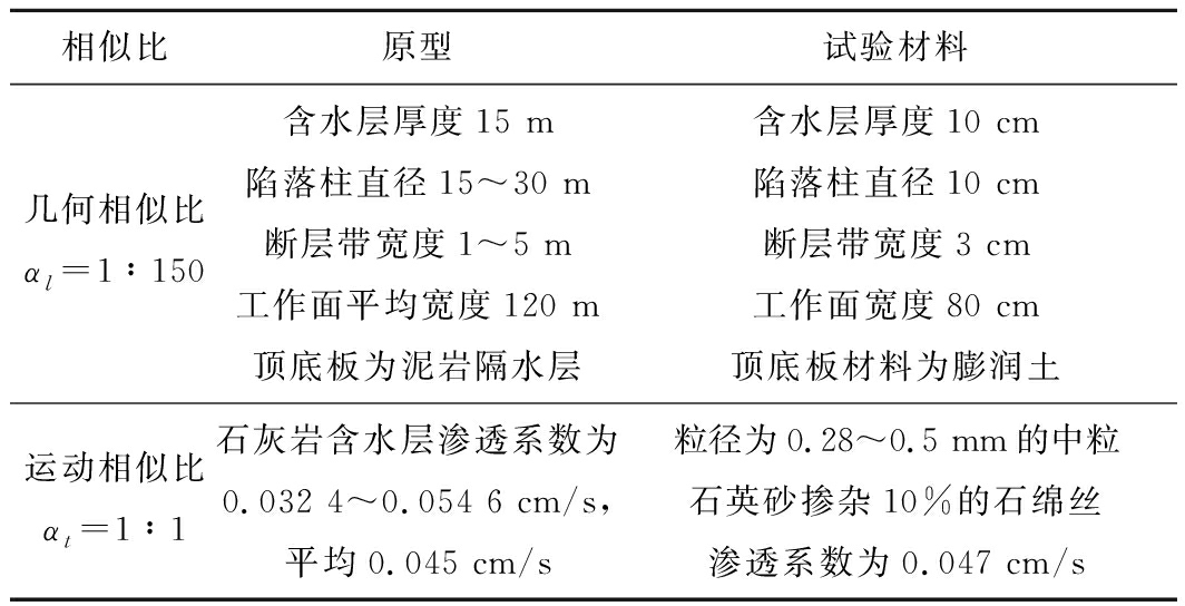 相似比原型试验材料几何相似比αl=1∶150含水层厚度15 m陷落柱直径15~30 m断层带宽度1~5 m工作面平均宽度120 m顶底板为泥岩隔水层含水层厚度10 cm陷落柱直径10 cm断层带宽度3 cm工作面宽度80 cm顶底板材料为膨润土运动相似比αt=1∶1石灰岩含水层渗透系数为0.032 4~0.054 6 cm/s,平均0.045 cm/s粒径为0.28~0.5 mm的中粒石英砂掺杂10%的石绵丝渗透系数为0.047 cm/s