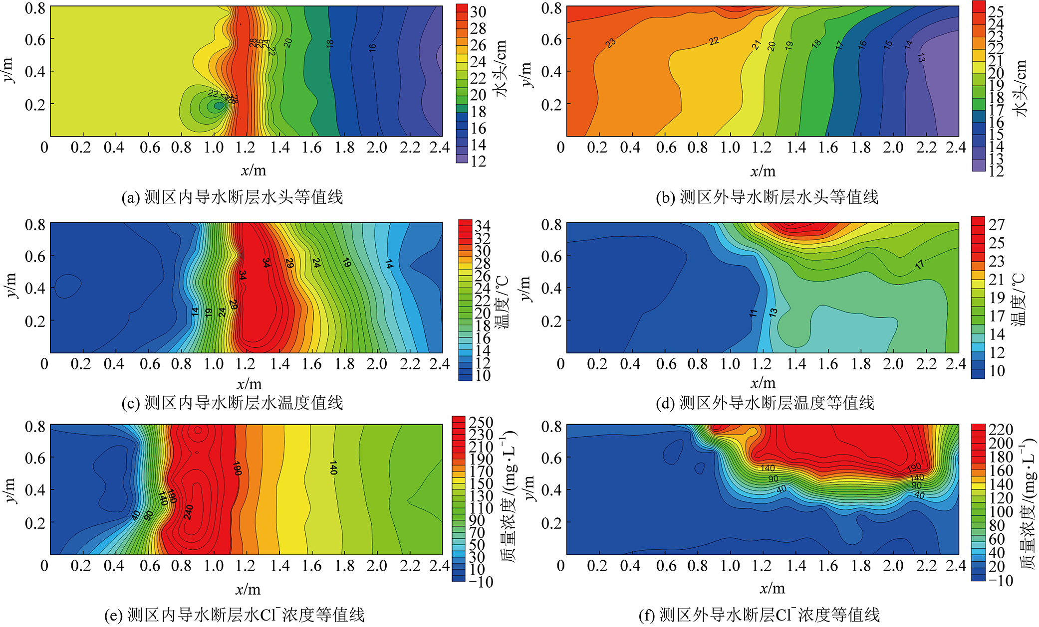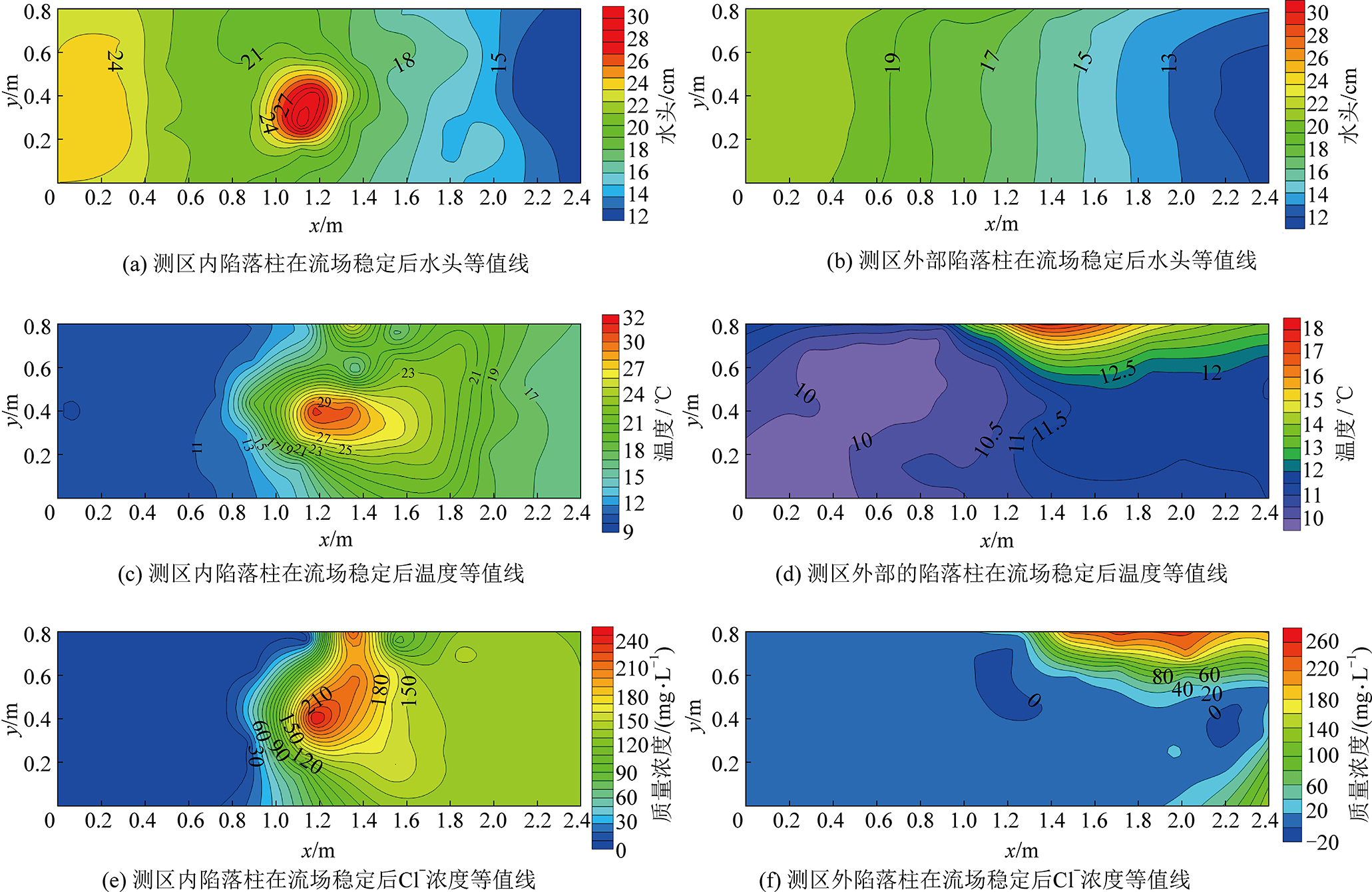 1)当陷落柱危险源位于测区内部时,水头、温度和离子浓度等值线都呈现出以陷落柱为中心的闭合状,最大等值线闭合圈为陷落柱位置。水头等值线在背景流场的逆流方向水力梯度小,顺流方向水力梯度大;温度和浓度等值线规律则在背景流场顺流方向梯度小,逆流方向梯度大。