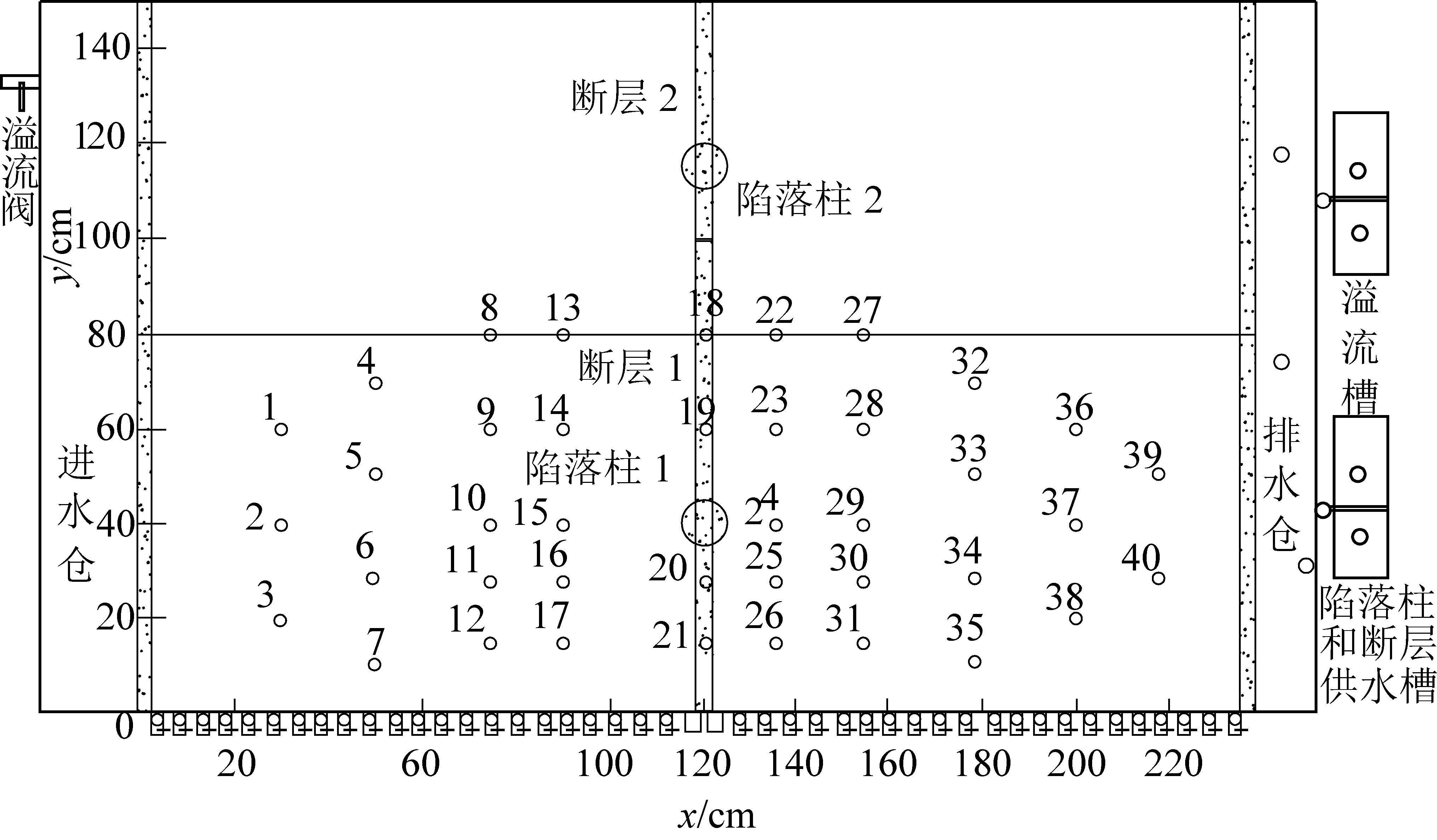 含水层内布置有陷落柱或断层,如图3所示。在测区内安排了40个监测点(图3),以检测温度、水头和浓度,其中温度由传感器和采集仪自动检测,水头由布置于水槽正面测压管人工读取,浓度由测压管下方的龙头水样人工测算,如图4所示。