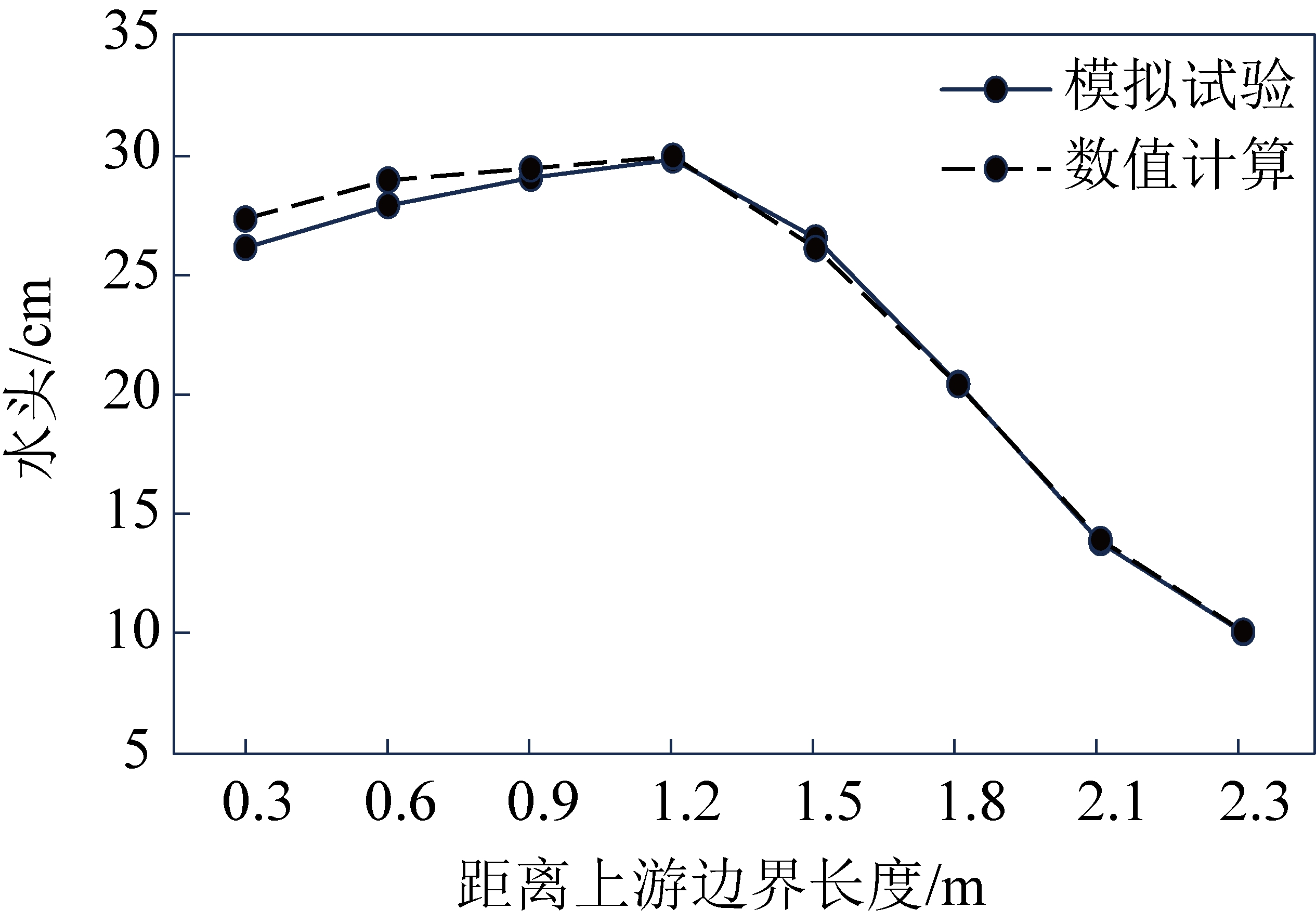 各指标等值线中红色区域为误差试算最小的危险源疑似区域。其中,根据水头拟合的计算结果与实际危险源的距离1.5 cm,根据温度效应拟合的计算结果与实际危险源的距离2.5 cm,根据浓度效应拟合的计算结果与实际的危险源中心误差3.0 cm。由于陷落柱的半径为10 cm,所以模拟得到的陷落柱危险源与实际的陷落柱存在着交叉重合区域,计算结果位于实际的危险源内。最终根据三大指标判断所得的重叠区域为图7a褐色阴影部分。本文以通过危险源中心线水头分布为例,比较模拟计算误差情况,如图8所示。