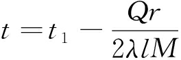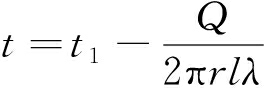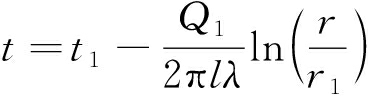 式中:Q1为热流量,W;l为陷落柱在含水层内的高度,m;r为到热源中心的距离,m;r1为热源边界至热源中心的距离,m;λ为导热系数,W/(m·K);t为待求温度,℃;t1为热源处的温度,℃。