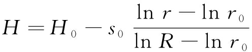 式中:H为距离垂直通道中心r处的水头高度,m;s0为垂直通道中心水头升高值,m;r0为垂直通道的半径,m;H0为垂直通道中心的水头高度,m;R为影响半径,m。