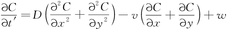 式中:v为渗流速度,L/s;D为水动力弥散系数,m2/s;C为物质的溶解浓度,mg/L;t′为时间,s;w为源汇项。