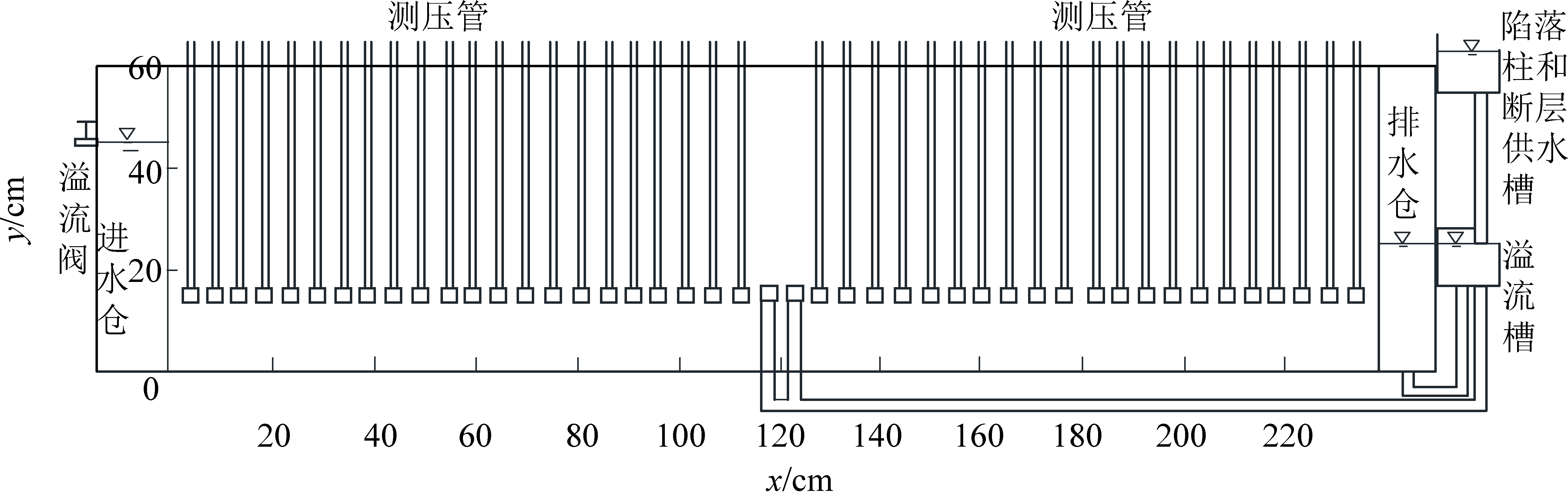图4 实验沙槽正视图和测压管、给排水机构分布