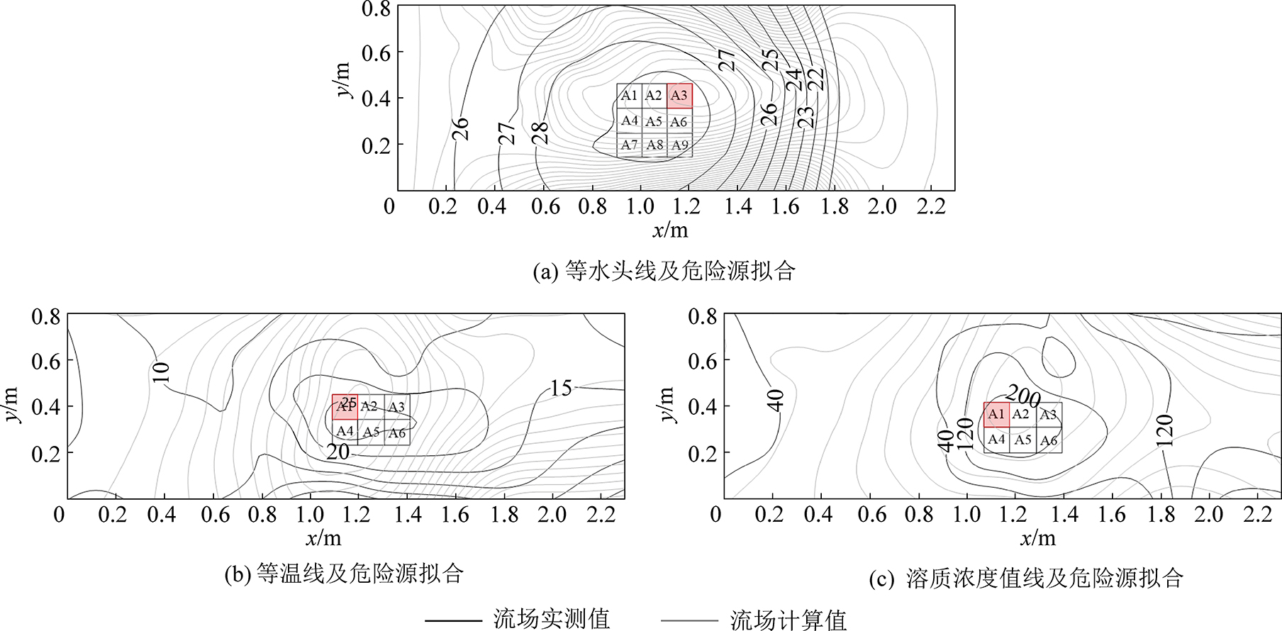 在测点足够多,水头差、温度差和浓度差足够大时,能够绘制出有惟一闭合圈或平行等值线图;若测点不足,指标差异不够大,则无法直观地对危险源进行定位,需对流场进行拟合计算。