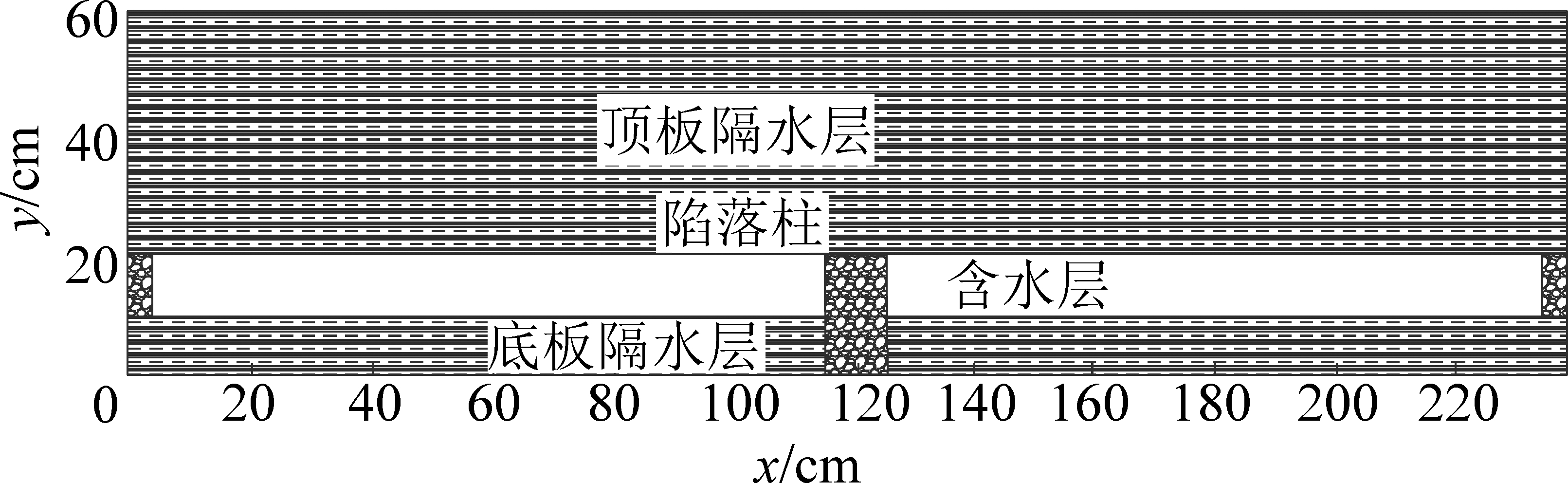 中央沙槽内的试验地层长和宽分别为x=240 cm和y=150 cm。其中,y=0~80 cm范围为测试区(工作面内部),y>80 cm部分为非测试区(工作面外部)。地层的剖面结构是:中间为含水层,上下都为隔水层。