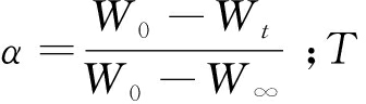 为热力学温度,℃;W0为煤体失重前的质量,mg;W∞为煤体失重结束时的质量,mg;Wt为煤体处于t时刻时的质量,mg;k为反应速率常数;f(α)为动力学机理函数,假设f(α)=(1-α)n,n为反应级数。