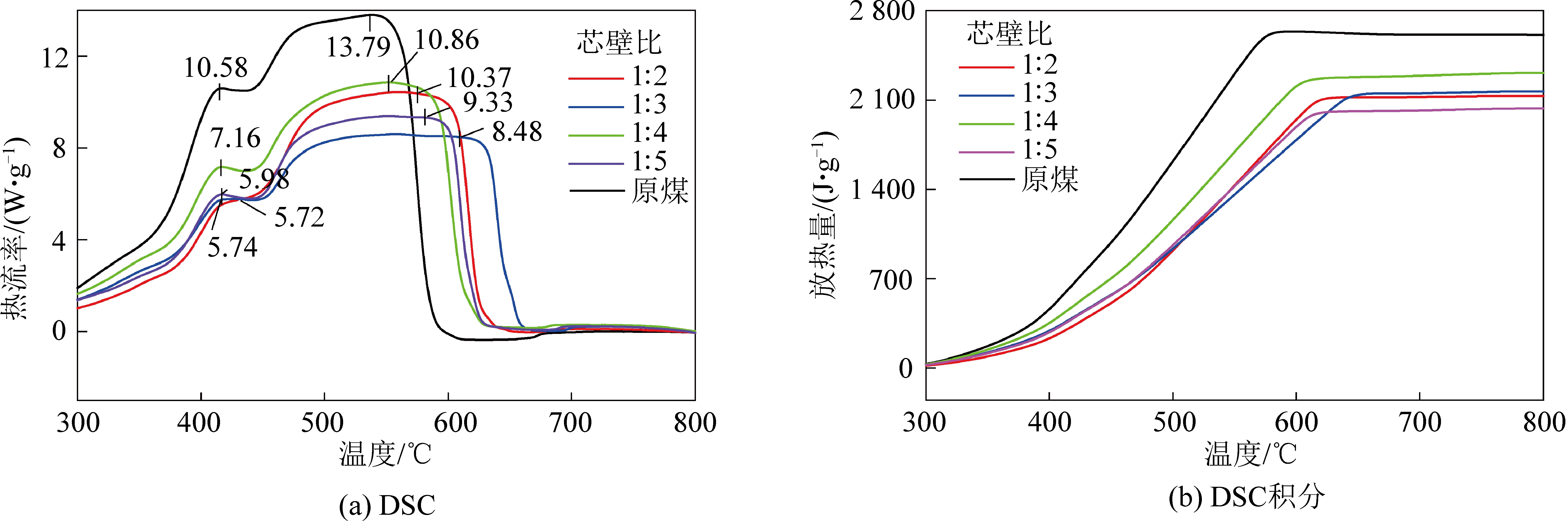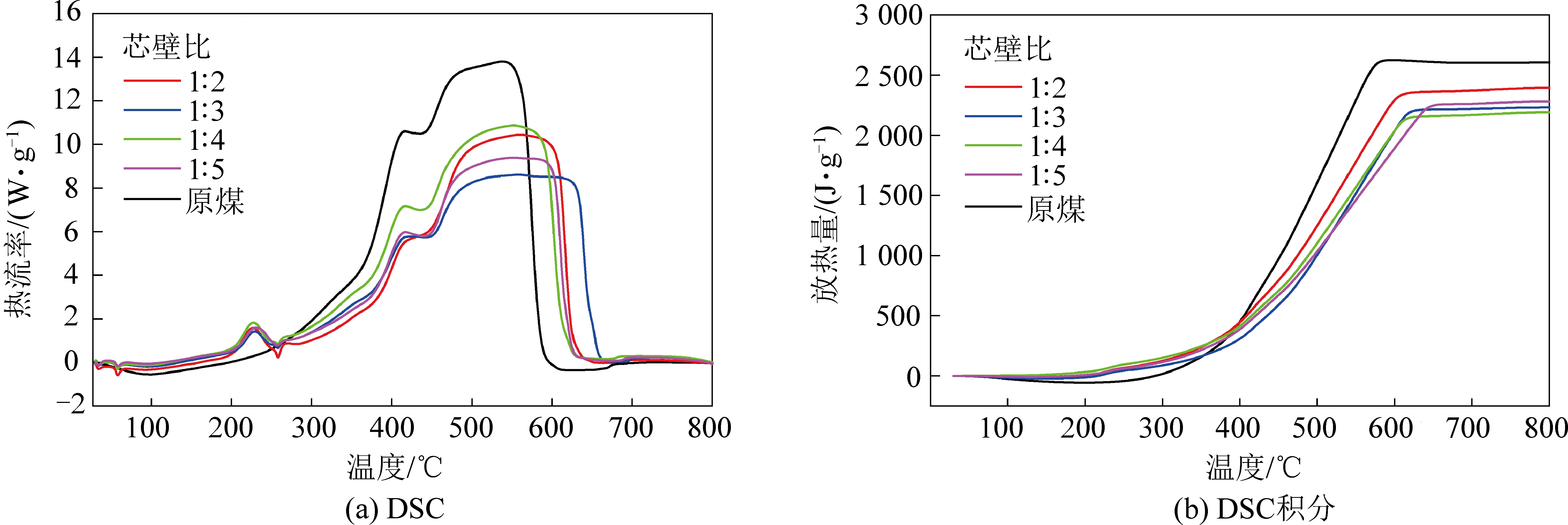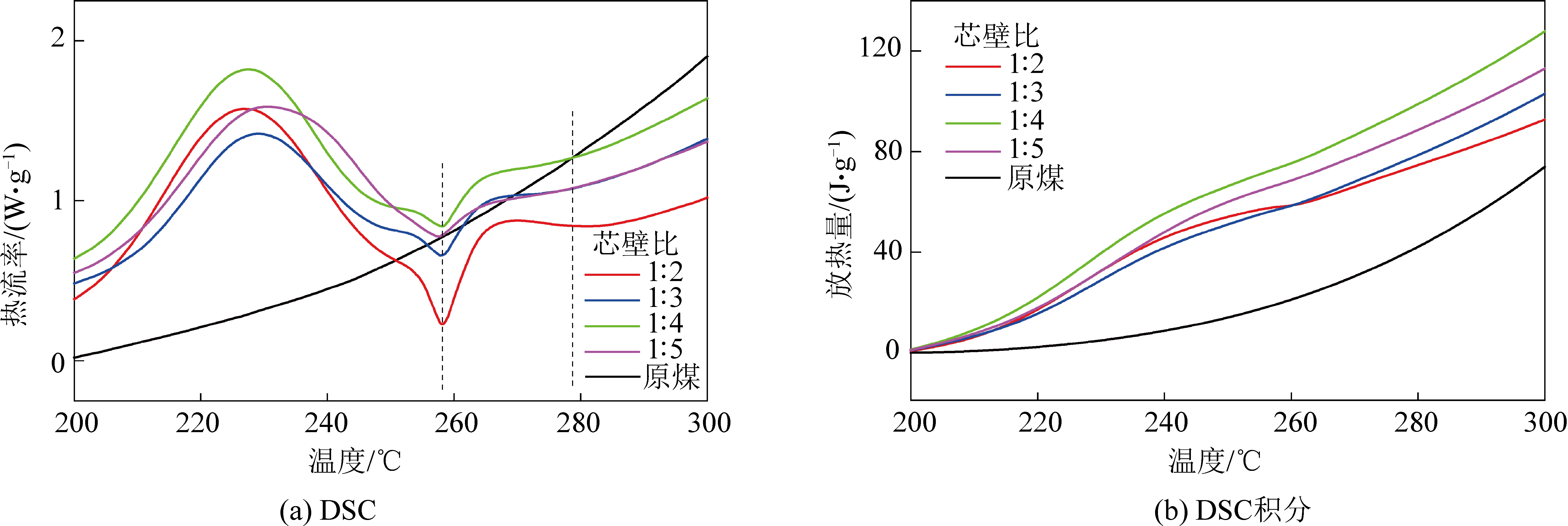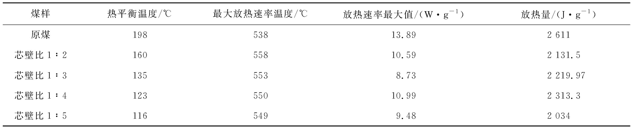 煤样热平衡温度/℃最大放热速率温度/℃放热速率最大值/(W·g-1)放热量/(J·g-1)原煤19853813.892 611芯壁比1∶216055810.592 131.5芯壁比1∶31355538.732 219.97芯壁比1∶412355010.992 313.3芯壁比1∶51165499.482 034