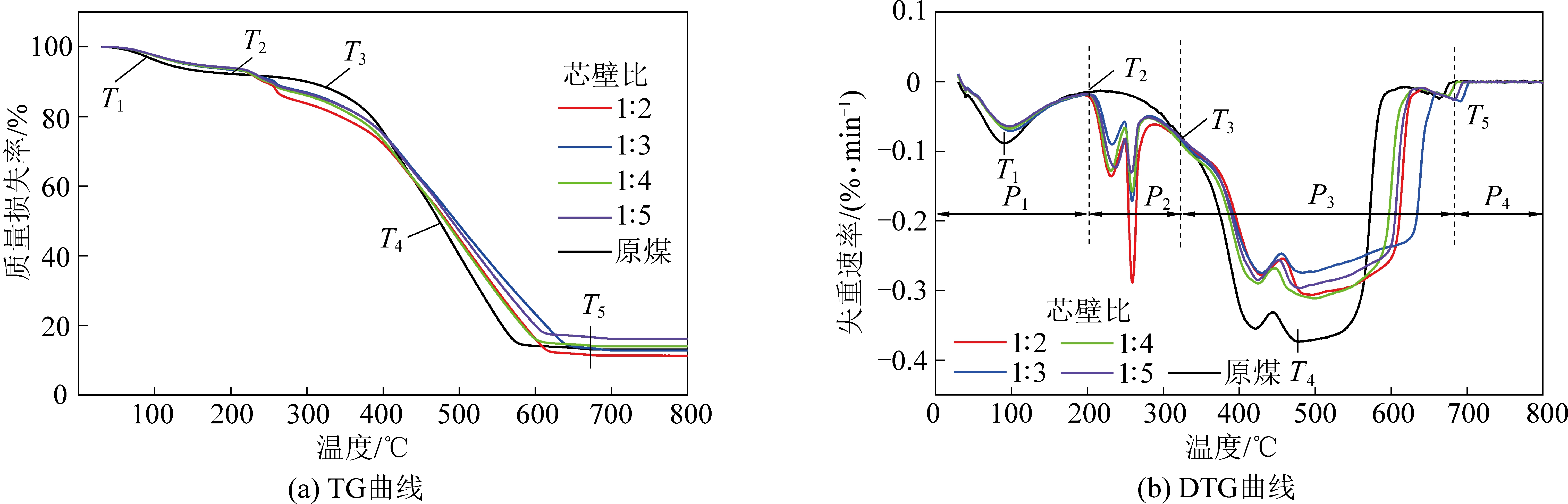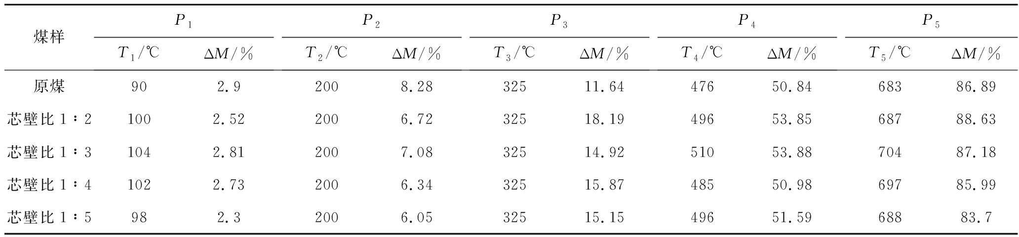 煤样P1T1/℃ΔM/%P2T2/℃ΔM/%P3T3/℃ΔM/%P4T4/℃ΔM/%P5T5/℃ΔM/%原煤902.92008.2832511.6447650.8468386.89芯壁比1∶21002.522006.7232518.1949653.8568788.63芯壁比1∶31042.812007.0832514.9251053.8870487.18芯壁比1∶41022.732006.3432515.8748550.9869785.99芯壁比1∶5982.32006.0532515.1549651.5968883.7