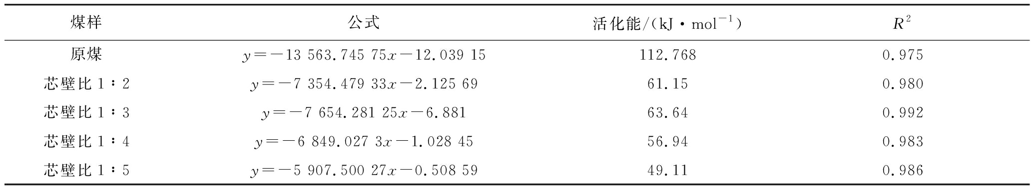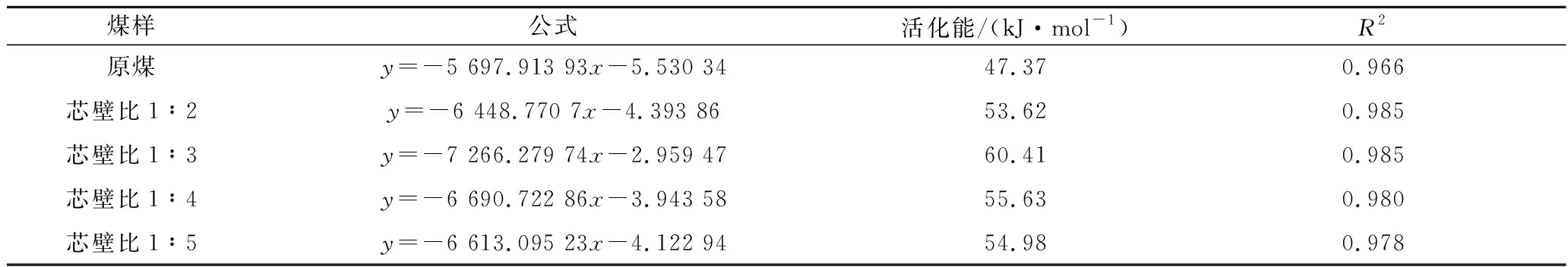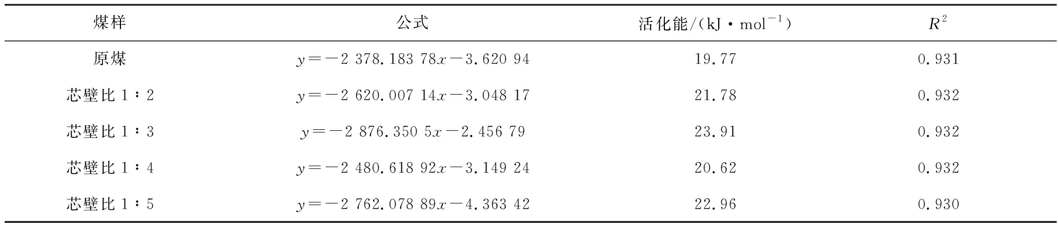 煤样公式活化能/(kJ·mol-1)R2原煤y=-13 563.745 75x-12.039 15112.7680.975芯壁比1∶2y=-7 354.479 33x-2.125 6961.150.980芯壁比1∶3y=-7 654.281 25x-6.88163.640.992芯壁比1∶4y=-6 849.027 3x-1.028 4556.940.983芯壁比1∶5y=-5 907.500 27x-0.508 5949.110.986