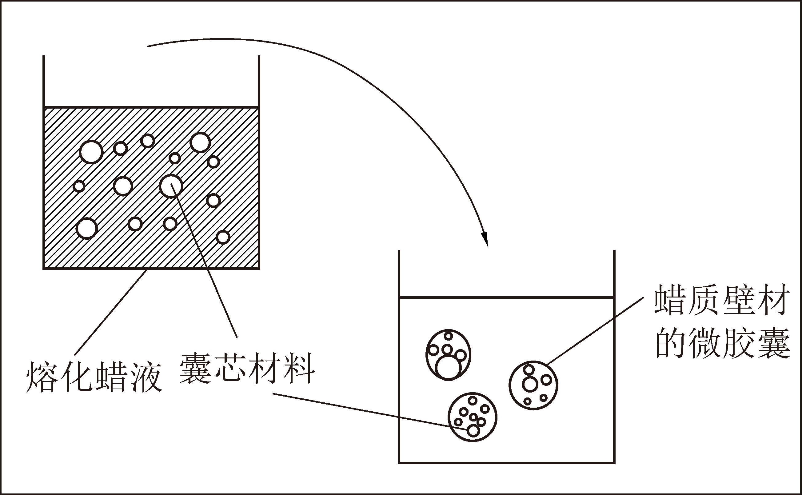 熔化分散冷凝法的制备原理是利用蜡状物、脂肪以及某些共聚物在受热时会发生软化变为液态这一性质来实现微胶囊化的。当壁材受热软化为液态后,将材料分散至液态蜡中形成分散体系,冷却时蜡状的壁材料就会围绕在芯材料周围重新固化形成微胶囊壁。图1为熔化分散冷凝法示意图,从图1中可以看出,熔化分散冷凝法制备微胶囊的基本流程是先把囊芯分散到熔化的石蜡中,再将其分散到介质水中,形成的微胶囊可为多核。