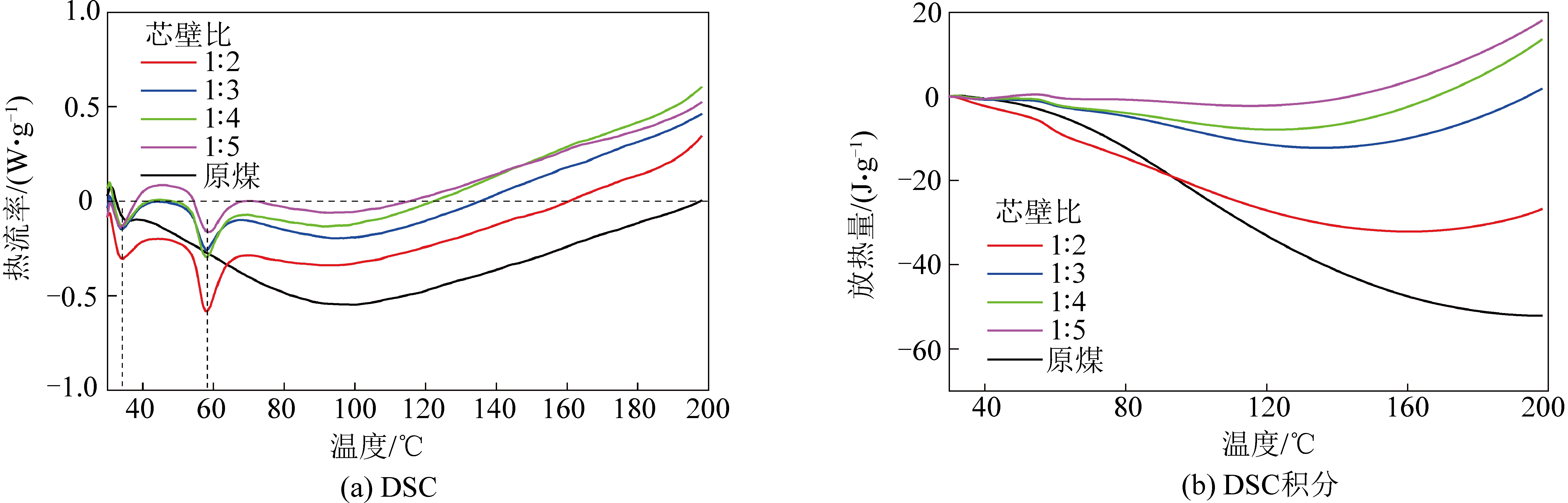 ①热效应阶段1。由图5可知,该阶段主要为原煤的初始放热阶段,原煤主要以吸热反应为主。阻化煤样也存在这样的吸热峰,并且随着芯壁比的减小,吸热峰的面积也随之减小。热流量由0.54 W/g 依次减小到0.34、0.19、0.13、0.06 W/g,放热量由-52.1 J/g依次增加到5.3、14.1、21.3、20.2 J/g。其原因是该阶段主要发生的是吸热反应,加入微胶囊后对反应具有一定的抑制作用,同时微胶囊也会分解放热,因此含阻化微胶囊煤样的放热量会大于原煤样。同时,还可以发现在34 ℃和58 ℃ 左右分别存在一个明显的吸热峰,且随着壁材添加量的增加而增强。这是由于在这两个温度下,壁材发生不同程度熔融吸热导致的。