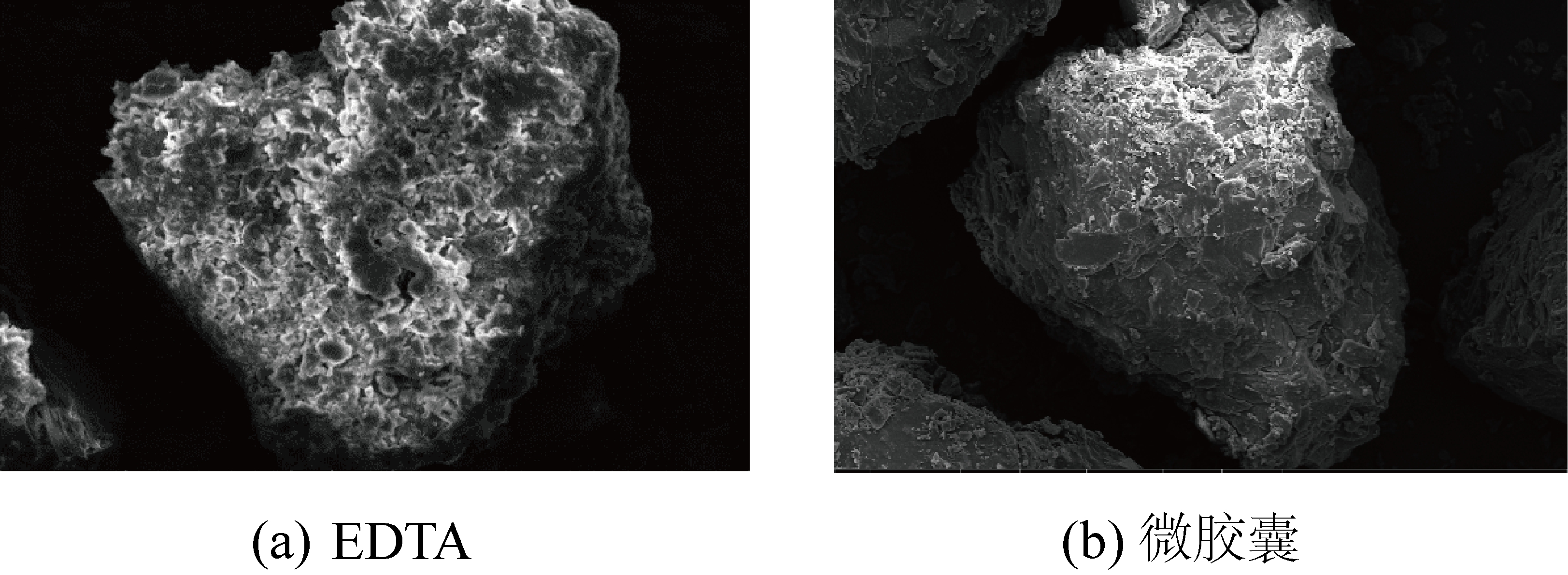 图2a为EDTA的SEM放大1 000倍图,可以看到很明显的桃心形状、环状结构,粒径在10~20 μm。这是由于EDTA分子的独特结构导致的,EDTA分子是多齿配体形成的配合物,是具有环状结构的配合物。图2b为阻化微胶囊的SEM放大1 000 倍图,可以看到表面呈现“丝状“的结构,光滑致密,并且表面附有一些微小的粒子,其原因是由于聚乙二醇熔融后再结晶所形成的。这说明PEG已经成功将EDTA包覆。