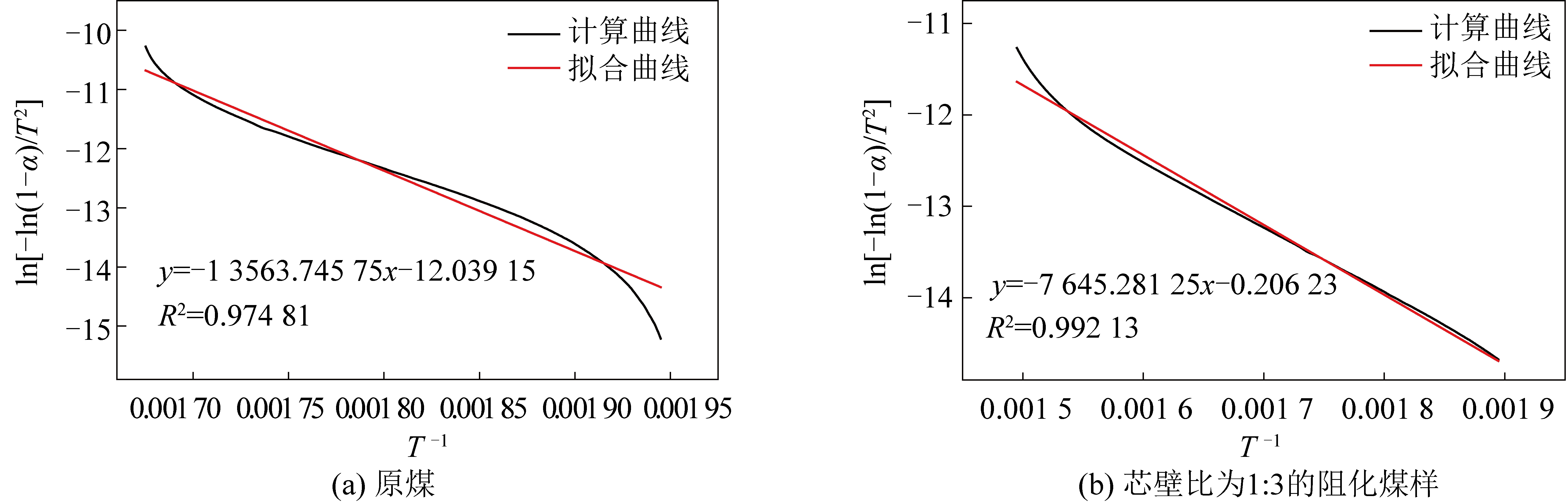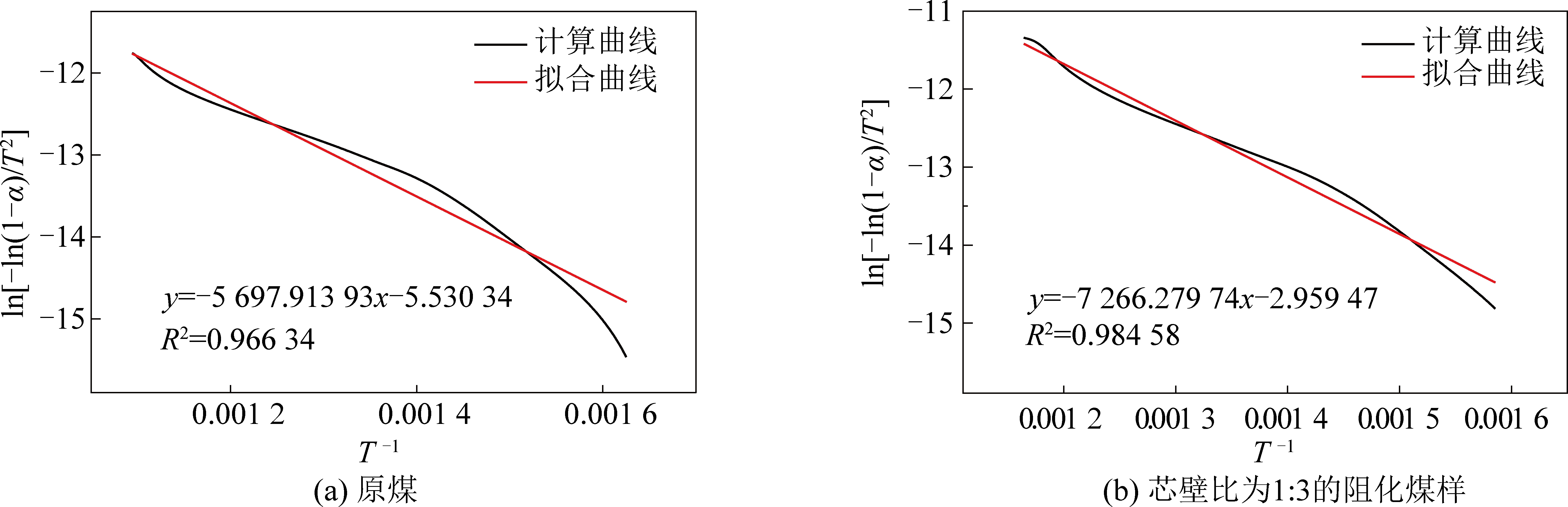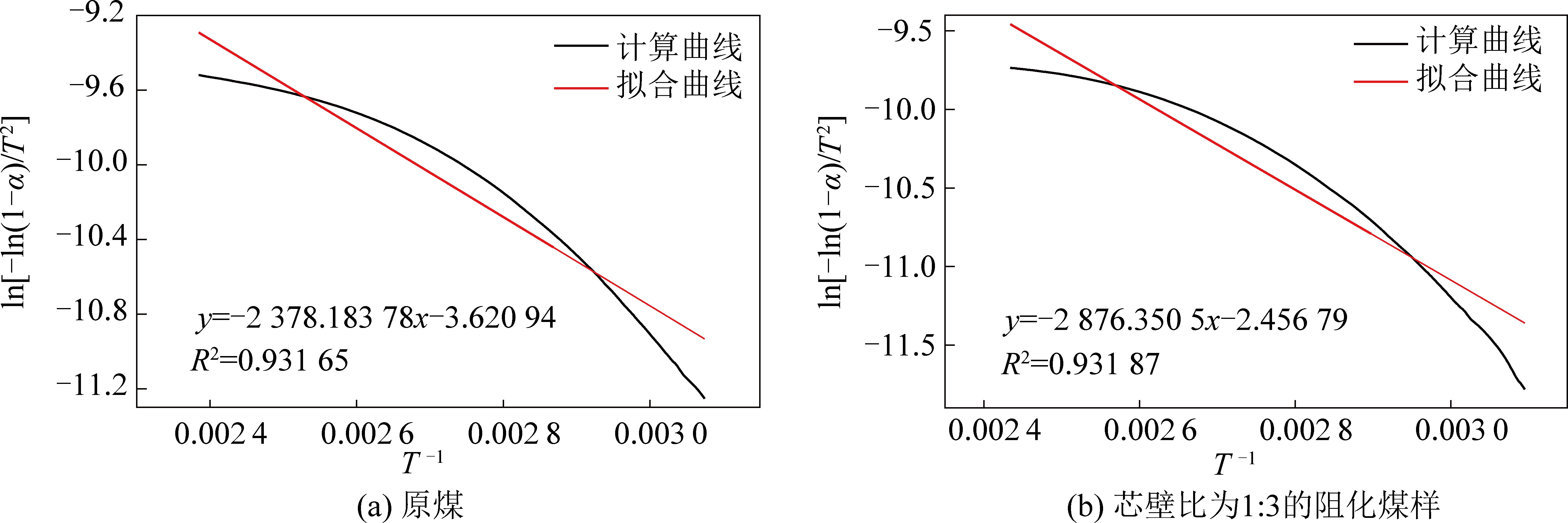 图8为P1阶段原煤和芯壁比为1∶3阻化煤样的活化能拟合曲线(其他阻化煤样研究方法相同),P1阶段活化能参数见表4。