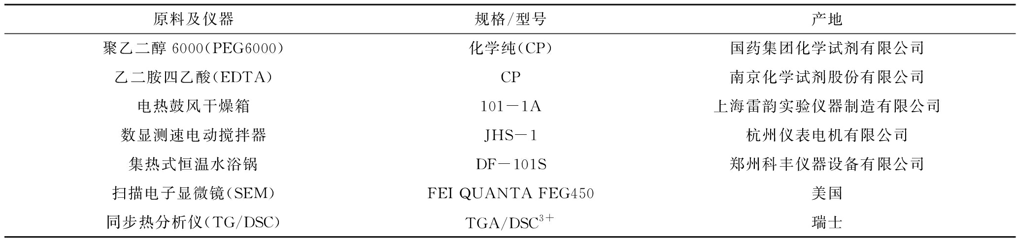 原料及仪器规格/型号产地聚乙二醇6000(PEG6000)化学纯(CP)国药集团化学试剂有限公司乙二胺四乙酸(EDTA)CP南京化学试剂股份有限公司电热鼓风干燥箱101-1A上海雷韵实验仪器制造有限公司数显测速电动搅拌器JHS-1杭州仪表电机有限公司集热式恒温水浴锅DF-101S郑州科丰仪器设备有限公司扫描电子显微镜(SEM)FEI QUANTA FEG450美国同步热分析仪(TG/DSC)TGA/DSC3+瑞士