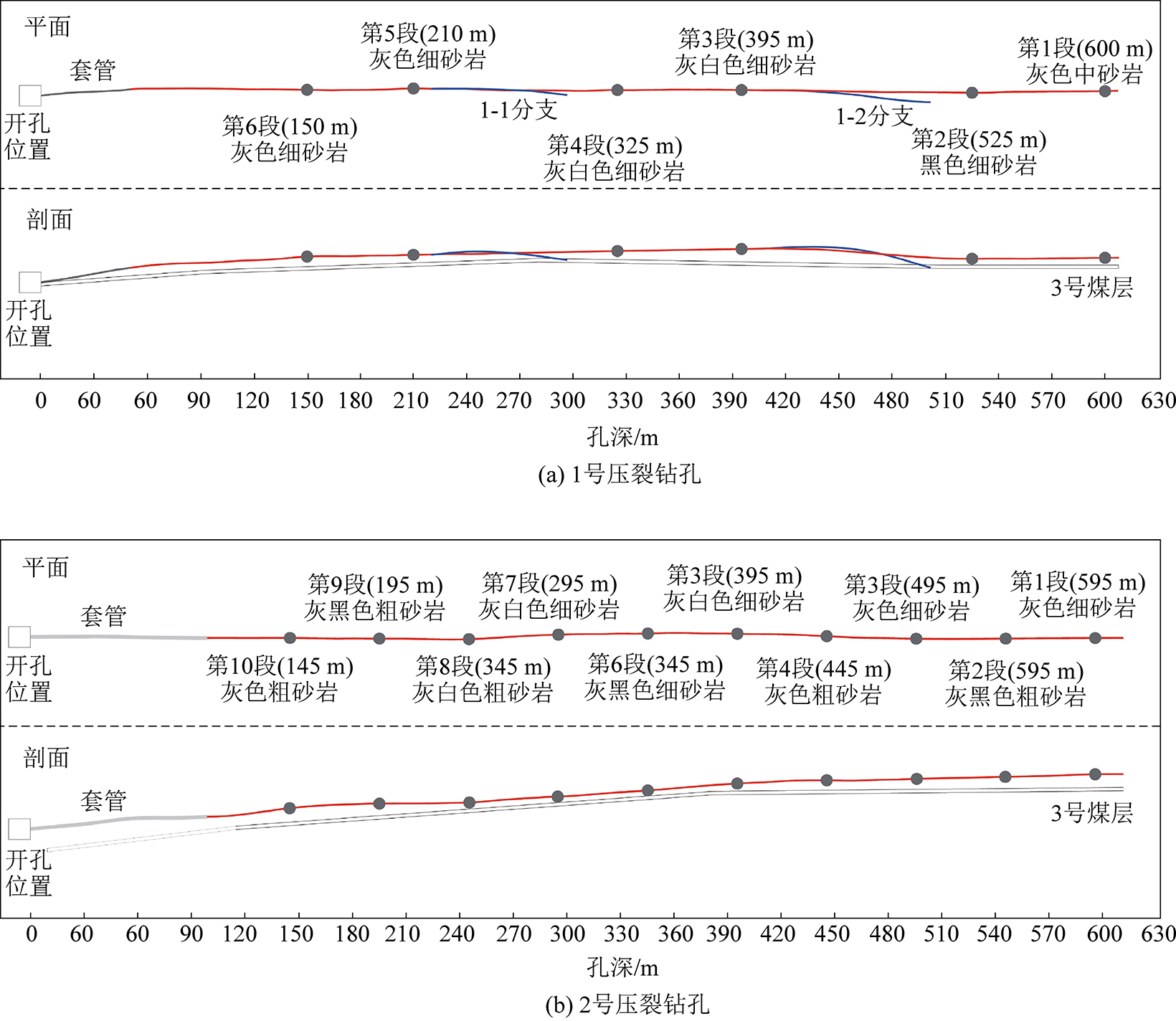 设计2个压裂钻孔,设计钻孔深度均为600 m,孔径120 mm,与煤层垂距4~5 m。利用ZDY12 000 LD型定向钻机施工煤层顶板定向压裂长钻孔,采用两级钻孔结构,一开钻孔直径120 mm,经过153、193、215 mm三次扩孔,下ø146 mm套管并注水泥浆固孔。1号压裂钻孔主孔孔深度609 m,下35 m套管,主孔裸眼段574 m。为控制钻孔与煤层垂距,施工2个S分支探测主孔与煤层间距,在孔深216 m处向煤层施工1-1号分支,长度110 m;在孔深425 m处向煤层施工1-2号分支,长度154 m,累计钻探进尺873 m,钻孔平(剖)面图如图4a所示。2号压裂钻孔主孔孔深609 m,下90 m 套管,主孔裸眼段519 m,未开分支孔,钻孔平(剖)面图如图4b所示。