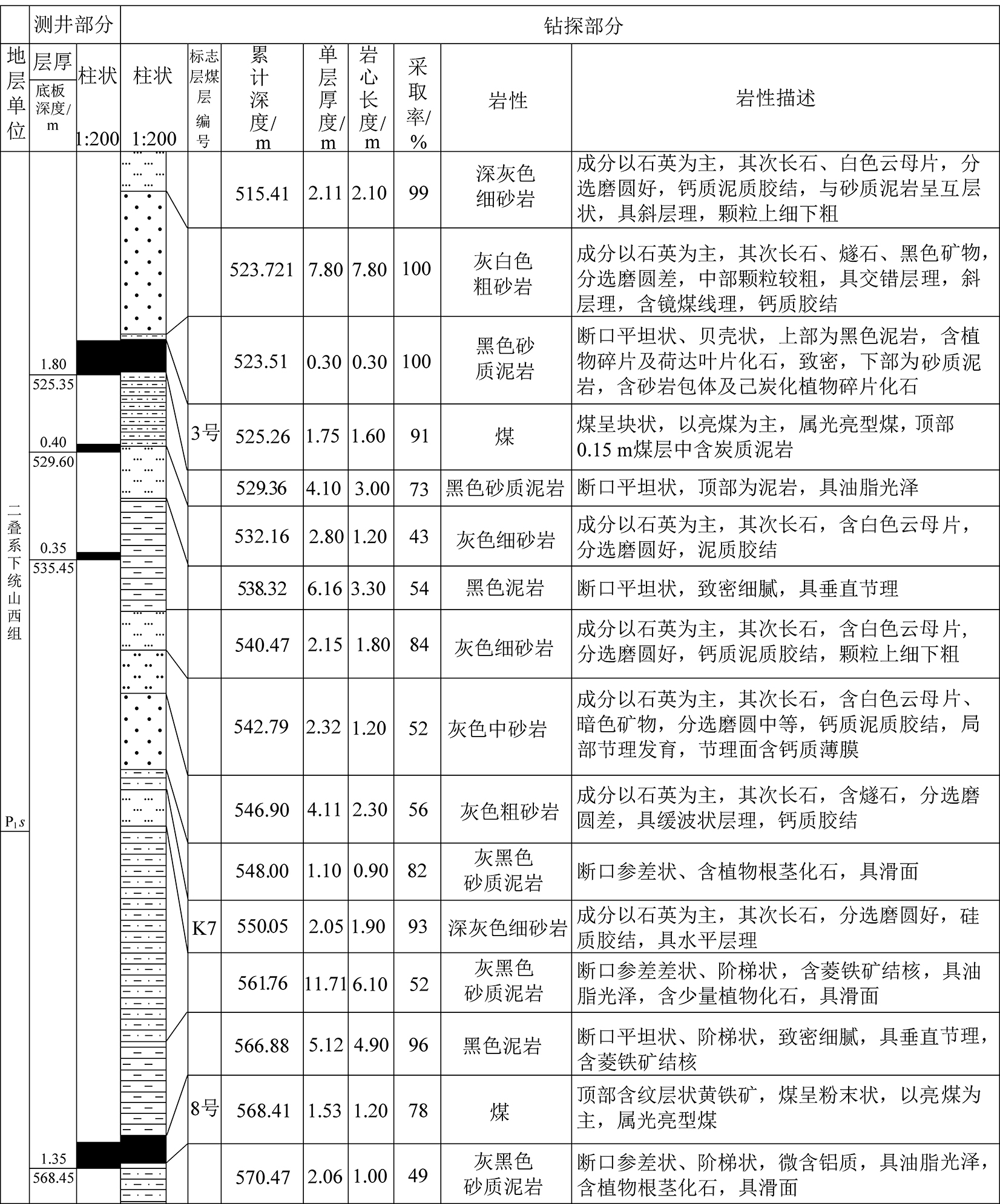 综上所述:优选3号煤层顶板砂岩层作为压裂钻孔施工层位,距离煤层上方4~5 m,其岩性主要为中粒砂岩和粉砂岩,岩性颜色主要为白色和灰白,下部泥岩为灰黑色,颜色辨识度高,且整体上仰有利于钻孔岩性的判识和轨迹的控制。