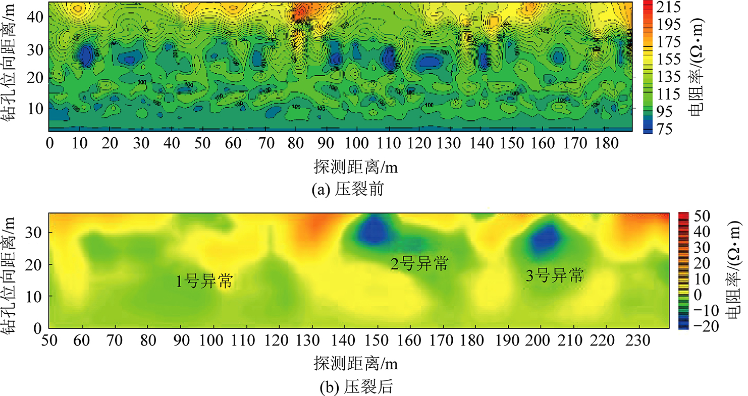压裂前、后瞬变电磁测试结果如图6所示。图中蓝、绿色部分为低阻异常区。