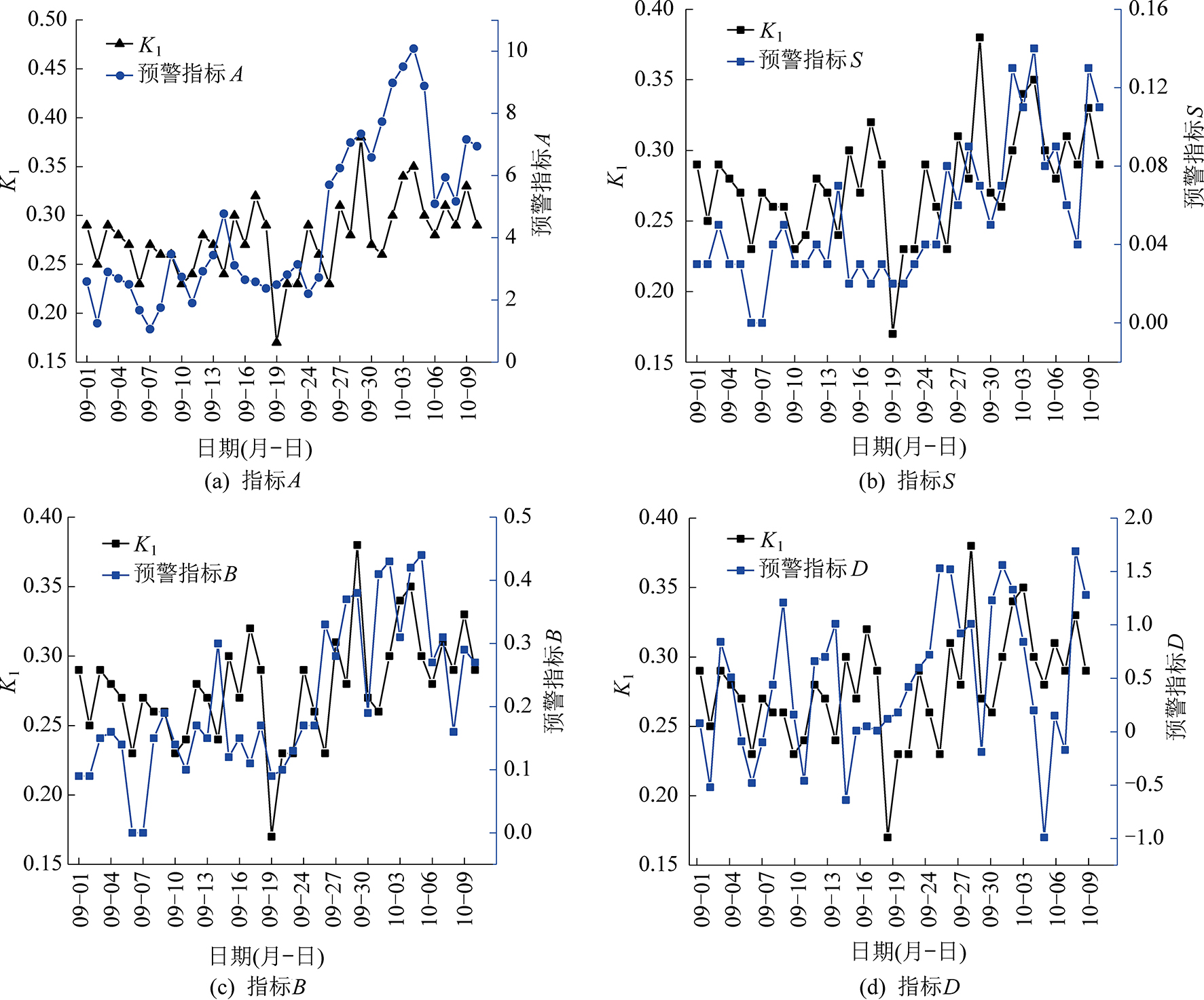 选取该煤矿12171里段运输巷在2020-09-01—2020-10-10的数据,对4个典型预警指标A、B、S、D(预警指标释义见表1)进行对比分析和相关性分析。通过绘制预警指标与实测防突预测数据K1的趋势线进行对比分析(图3)。