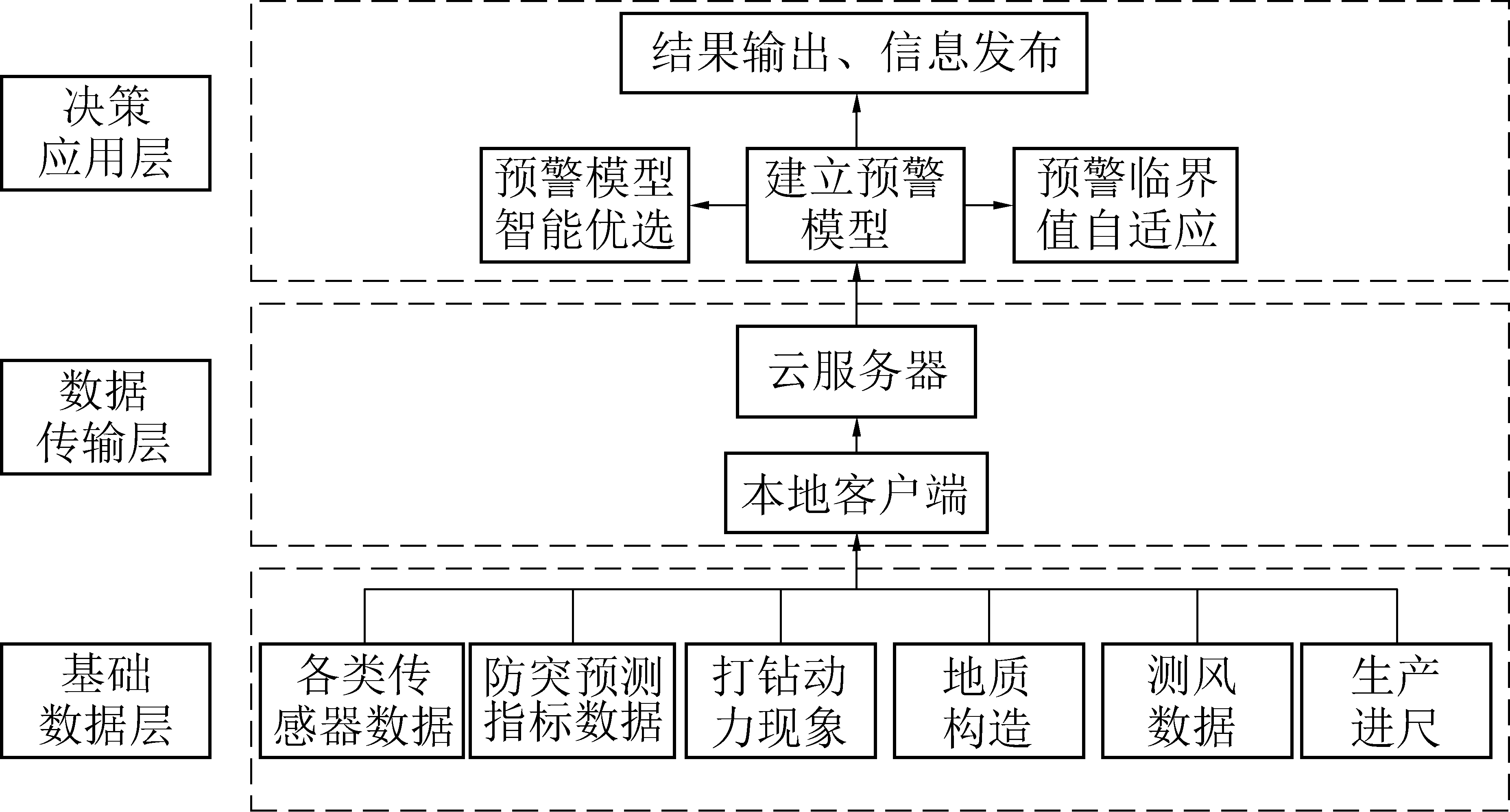 多源数据驱动融合防突智能预警系统是利用煤矿生产过程中产生的多源数据,打通数据传输通道、建立预警模型算法、分析并发布计算结果,以此来实现防突预警的目的[13-14]。系统设计在智能化煤矿设计原则指导下,应用数据驱动和辅助智能决策思维,结合煤矿生产条件进行设计。多源数据驱动融合的防突智能预警结构设计如图1所示,结构包括基础数据层、数据传输层和决策应用层。