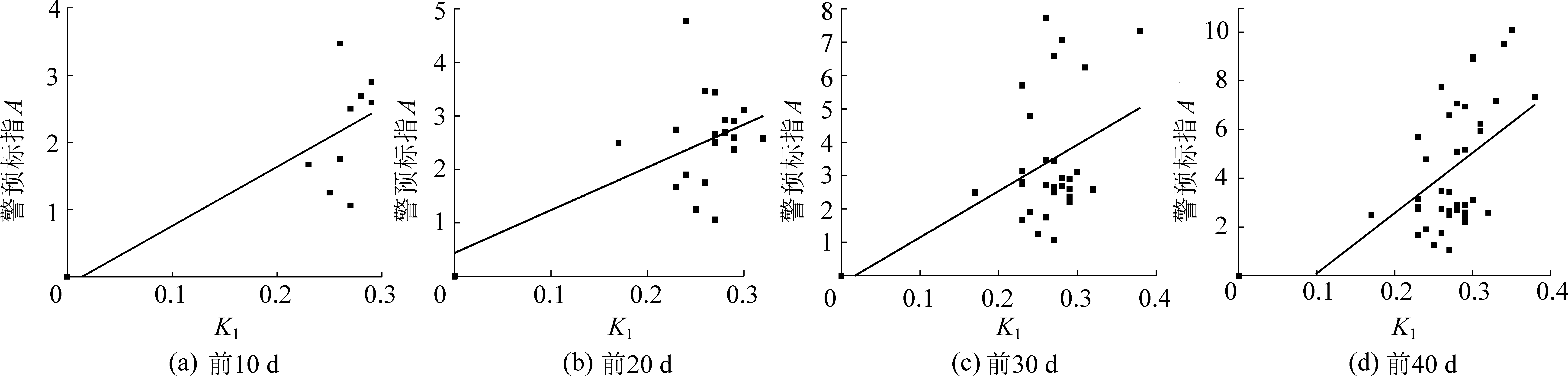 对该煤矿12171里段运输巷2020-09-01—2020-10-10期间实测值K1和对应的预警A指标数据进行处理,通过回归分析,计算各时间段内2者之间的关系,如图4所示。
