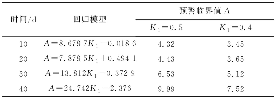 时间/d回归模型预警临界值AK1=0.5K1=0.410A=8.678 7K1-0.018 64.323.4520A=7.878 5K1+0.494 14.433.6530A=13.812K1-0.372 96.535.1240A=24.742K1-2.3769.997.52