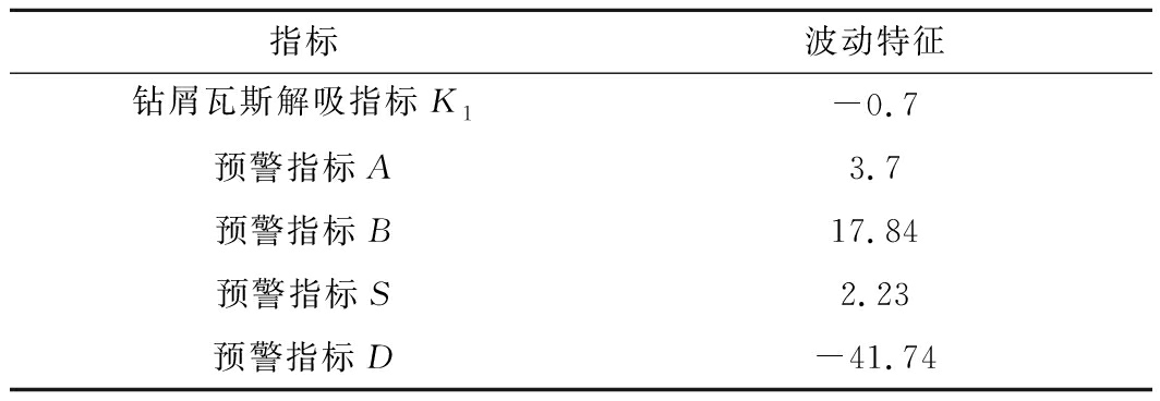 指标波动特征钻屑瓦斯解吸指标K1-0.7预警指标A3.7预警指标B17.84预警指标S2.23预警指标D-41.74