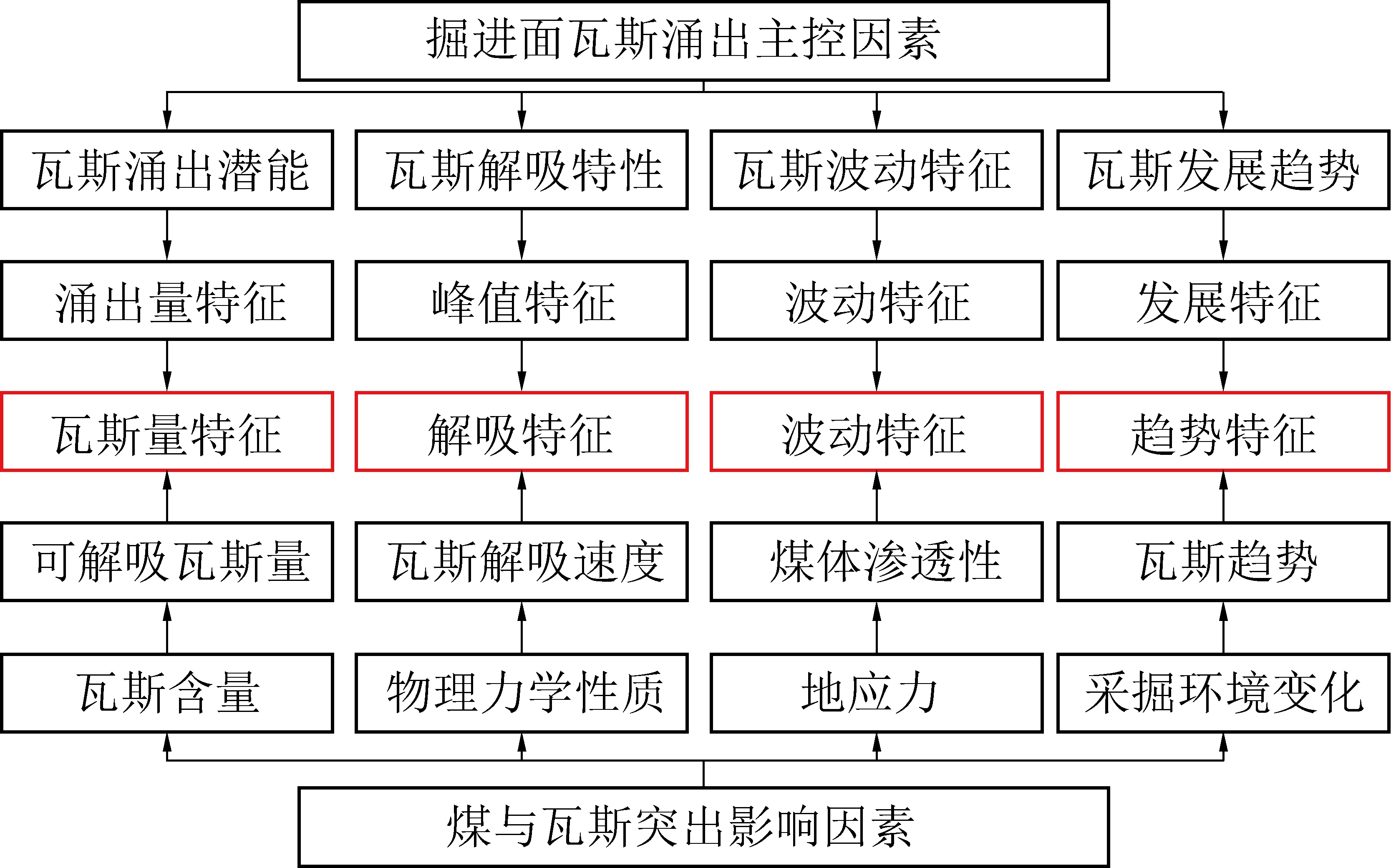 在整个数据驱动防突预警技术中,防突预警模型的建立是核心。防突预警模型的建立是根据煤与瓦斯突出发生发展机理,结合综合作用假说理论,通过对煤与瓦斯突出的主要影响因素进行反演,捕捉突出发生的前兆特征[15-18]。根据目前煤与瓦斯突出的预测手段,突出预警模型的建立主要通过多源数据反演煤体的瓦斯含量、煤体结构及地应力等特征,其中瓦斯含量是重点。煤体瓦斯含量是煤体瓦斯涌出潜能的直接表现,煤体瓦斯涌出量的多少最终取决于煤体本身拥有的瓦斯含量或者瓦斯潜能的多少[19-20]。通过对煤与瓦斯突出的影响因素和工作面瓦斯涌出的主控因素分析,建立了瓦斯量特征、解吸特征、波动特征和趋势特征的四大类预警模型,如图2所示。