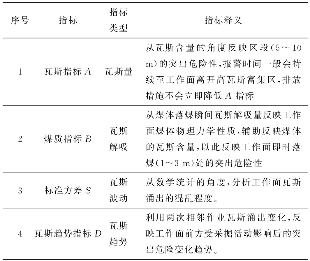 序号指标指标类型指标释义1瓦斯指标A瓦斯量从瓦斯含量的角度反映区段(5~10 m)的突出危险性,报警时间一般会持续至工作面离开高瓦斯富集区,排放措施不会立即降低A指标2煤质指标B瓦斯解吸从煤体落煤瞬间瓦斯解吸量反映工作面煤体物理力学性质,辅助反映煤体的瓦斯含量,以此反映工作面即时落煤(1~3 m)处的突出危险性3标准方差S瓦斯波动从数学统计的角度,分析工作面瓦斯涌出的混乱程度。4瓦斯趋势指标D瓦斯趋势利用两次相邻作业瓦斯涌出变化,反映工作面前方受采掘活动影响后的突出危险变化趋势。