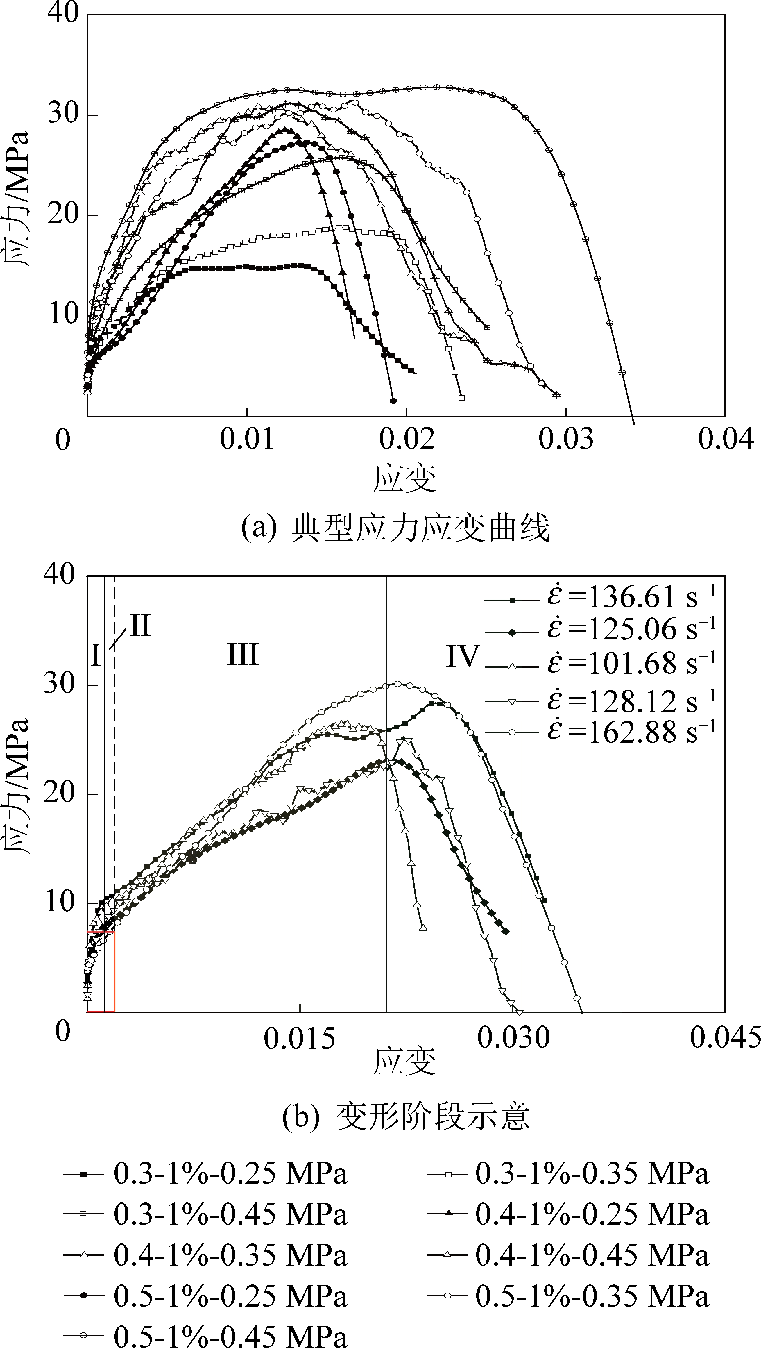 图3a中,随着冲击气压的增大,各组PPF增强砂浆试件的动弹性模量和峰值应力均有提高,而且塑性有相应增强,峰值应力、极限韧性、极限应变均具有显著的应变率效应。由图3a,不同水灰比的PPF增强砂浆的峰值应力、极限应变均随着冲击气压的增大而有所提高。在高应变率冲击下,冲击荷载作用于试件的时间太短,不足以能量累积,而且裂纹扩展滞后于加载速度,导致应力提升,同时更多的裂纹产生导致试件变形增大。部分曲线出现短暂的下凹段是应力跌落现象[15]。各试件应力应变曲线均有相似的特征,为了便于分析PPF增强砂浆内部能量变化,将选取的部分大小形状相近的典型应力应变曲线(图3b)分为弹性阶段(Ⅰ)、裂隙扩张阶段(Ⅱ)、塑性变形阶段(Ⅲ)和破坏阶段(Ⅳ)进行表征。弹性阶段PPF增强砂浆的应力和应变成正相关,外力的能量不断转换为试件的弹性势能;达到弹性极限应力以后, 试件内部微破坏开始发展形成损伤,随后应力随应变增加而缓慢增长进入塑性变形阶段,此时曲线呈上凸特征,在这个阶段,外力的能量被内部结构的改变而耗散;达到屈服应力后,应力随着应变的微小增加而急剧下降,裂纹贯穿试件发生破坏。与刘娟红等[2,22]研究相比,缺少初始压密阶段,这是因为试件在初始阶段承载的应变率较高,内部微裂纹没有足够的反应时间闭合,直接进入弹性阶段(图3b)。