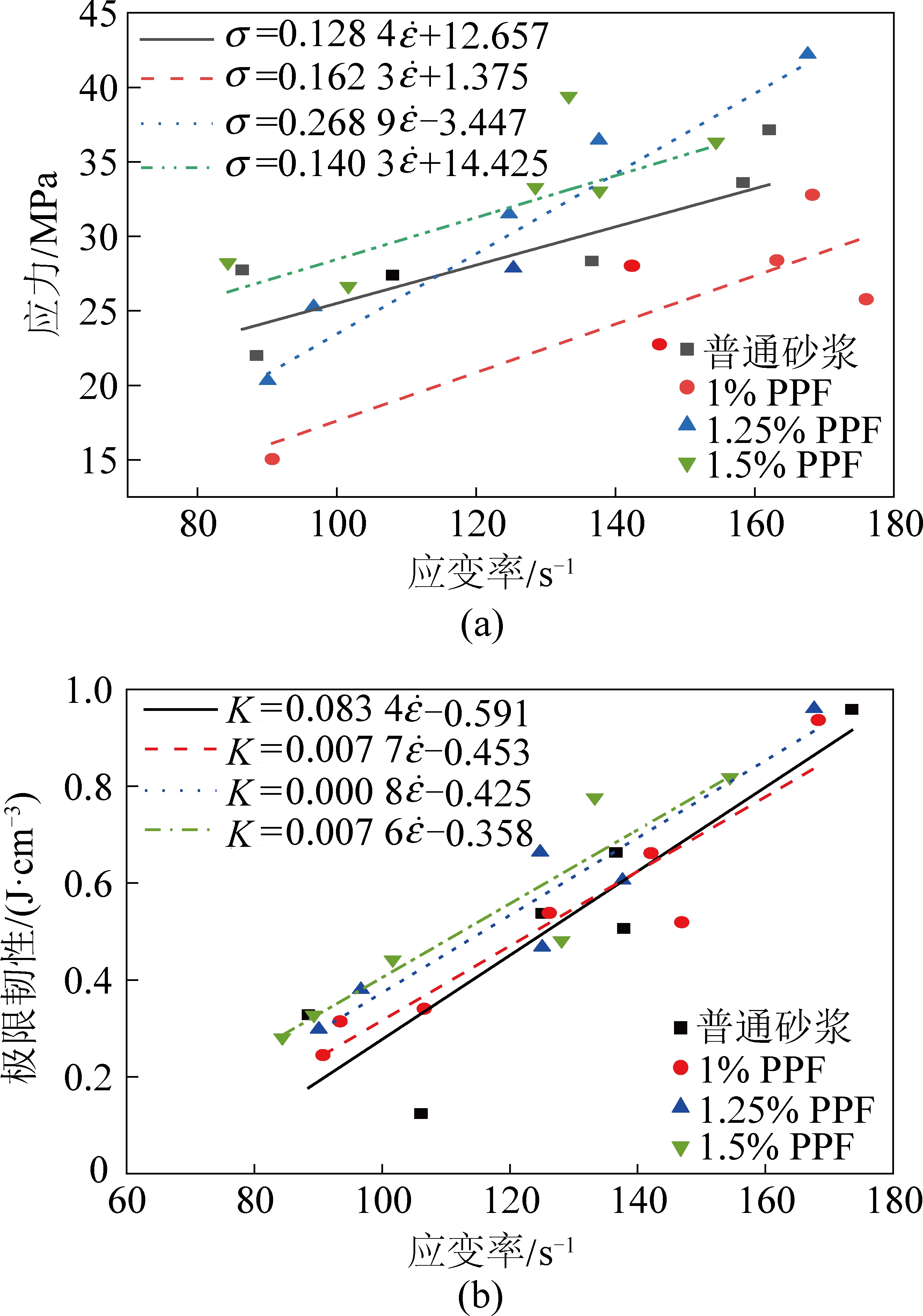 随着应变率的增加,各组试件的动态抗压强度和极限韧性均呈递增趋势,具有明显的应变率效应,且可近似线性表示。由图5a可发现,PPF增强砂浆的动态抗压强度随着纤维掺量的增加而增大,PPF体积掺量为1.25%时动态抗压强度增长趋势最快,且在高应变率载荷下动态抗压强度最高,说明PPF体积掺量在1.25%时其应变率敏感性强于其他掺量的试件。但是当PPF掺量为1%的砂浆组拟合曲线在普通砂浆组下方,即动态抗压强度有所降低。