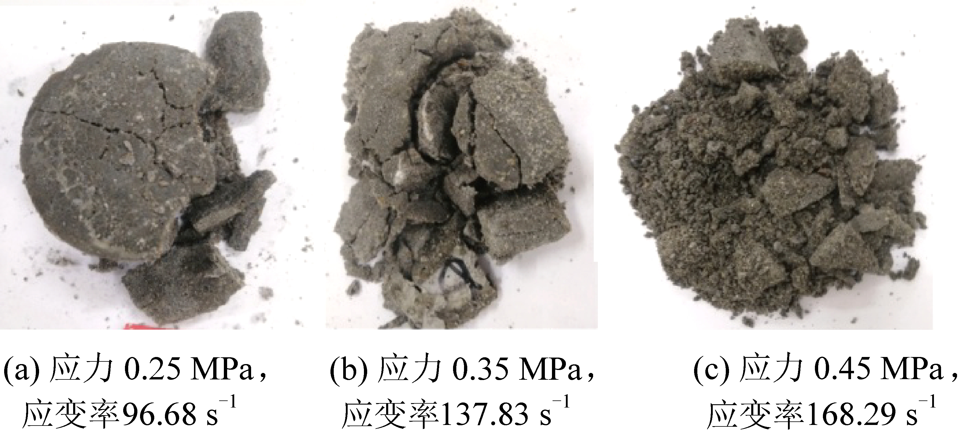 不同冲击气压时试件的典型破坏形态如图2所示。随着冲击气压由0.25 MPa增大至0.45 MPa,试件的破碎程度越来越高,碎块块度平均粒径不断减小,低应变率作用时裂纹呈轴向劈裂破坏,而应变率较高时则是颗粒状粉碎破坏,表现出显著的应变率效应。试件在承受单轴冲击作用时,应力波经过入射杆在试件内部传播,微裂纹、孔隙等微缺陷被激活并发展,裂纹发展所需的能量低于裂纹形成所需的能量,当试件积聚更高的能量,裂纹扩展滞后于能量的积累,初始裂纹相互贯通,同时会产生更多的细小裂纹并参与到破坏过程中,使试件压碎、磨碎;在低应变率下,微裂纹沿着已有的薄弱缺陷开始沿着平行于压应力的方向发展,无需以破裂为更多碎块来消耗能量,表现为碎块的目数增大,破坏碎块尺度趋于变大。冲击载荷作用下,试件损伤和破坏在瞬间完成,单仁亮[19]认为冲击破坏总是有两种及以上破坏形态,主要分为压剪破坏、拉应力破坏、张应变破坏和卸载破坏;陈庆寿等[20]对软、中硬和坚硬3类岩石的动载试验研究,认为破坏模式分为产生裂隙、中等破坏和强烈破碎;赵光明等[21]以混凝土和岩石试件在不同冲击速度下SHPB试验为基础,结合数值模拟将试件破坏有张应力破坏、轴向劈裂拉伸破坏和压碎破坏模式。图2中试件破坏模式并不单一,而是以轴向劈裂拉伸破坏和压剪破坏为主,和岩石类材料不同,没有张应变破坏阶段。