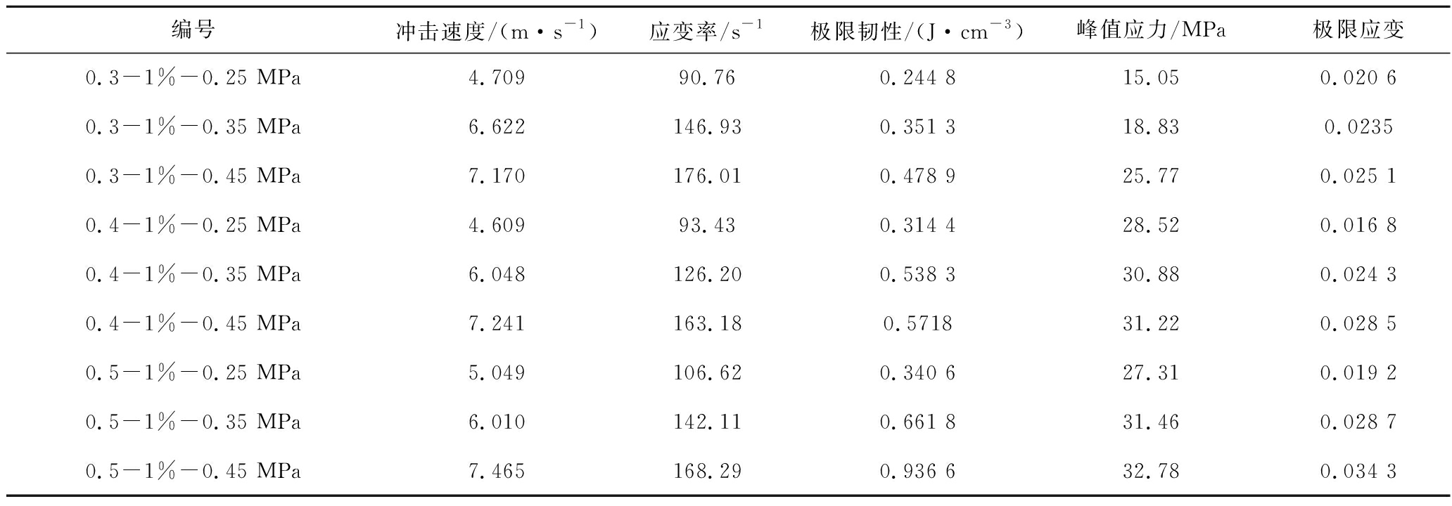 编号冲击速度/(m·s-1)应变率/s-1极限韧性/(J·cm-3)峰值应力/MPa极限应变0.3-1%-0.25 MPa4.70990.760.244 815.050.020 60.3-1%-0.35 MPa6.622146.930.351 318.830.02350.3-1%-0.45 MPa7.170176.010.478 925.770.025 10.4-1%-0.25 MPa4.60993.430.314 428.520.016 80.4-1%-0.35 MPa6.048126.200.538 330.880.024 30.4-1%-0.45 MPa7.241163.180.571831.220.028 50.5-1%-0.25 MPa5.049106.620.340 627.310.019 20.5-1%-0.35 MPa6.010142.110.661 831.460.028 70.5-1%-0.45 MPa7.465168.290.936 632.780.034 3