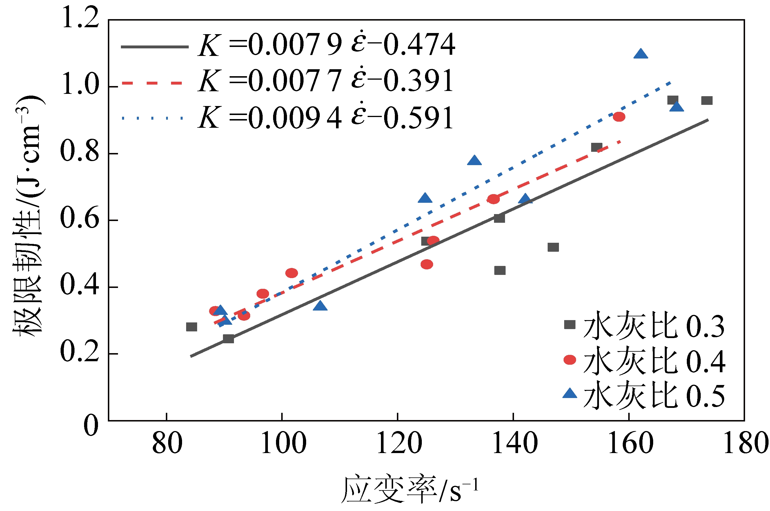 为进一步研究水灰比对PPF增强砂浆的抗冲击性能的影响,对3种不同水灰比的PPF增强砂浆极限韧性随应变率变化进行统计整合,如图4所示。
