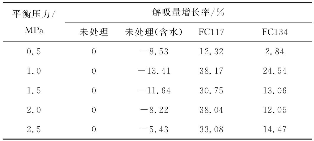 由图6a可知,随着甲烷吸附平衡压力的增加,3种处理方式的含水煤样解吸量均逐渐增加,且增加量均呈现逐渐减小趋势。经过气润湿反转剂FC117和FC134处理后的含水煤样解吸量始终大于未处理的煤样,与干燥煤样解吸量的规律基本一致。同时,在3种不同处理方式条件下,干燥煤样的解吸量均大于含水条件下的解吸量,其结果表明在含水煤样解吸过程中存在一定程度的水锁效应。