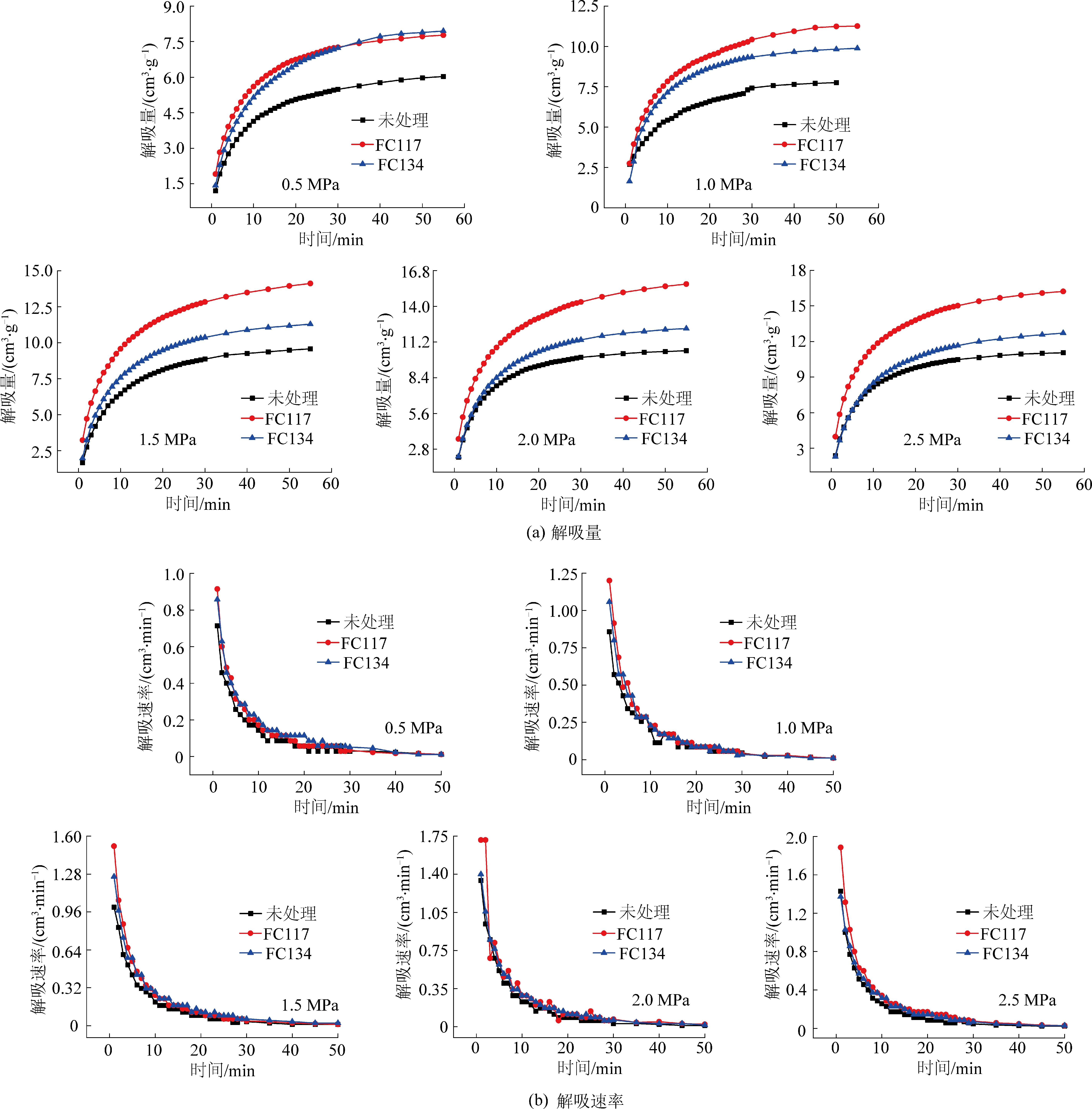 平衡压力/MPa解吸量增长率/%未处理未处理(含水)FC117FC1340.50-8.5312.322.841.00-13.4138.1724.541.50-11.6430.7513.062.00-8.2238.0412.052.50-5.4333.0814.47